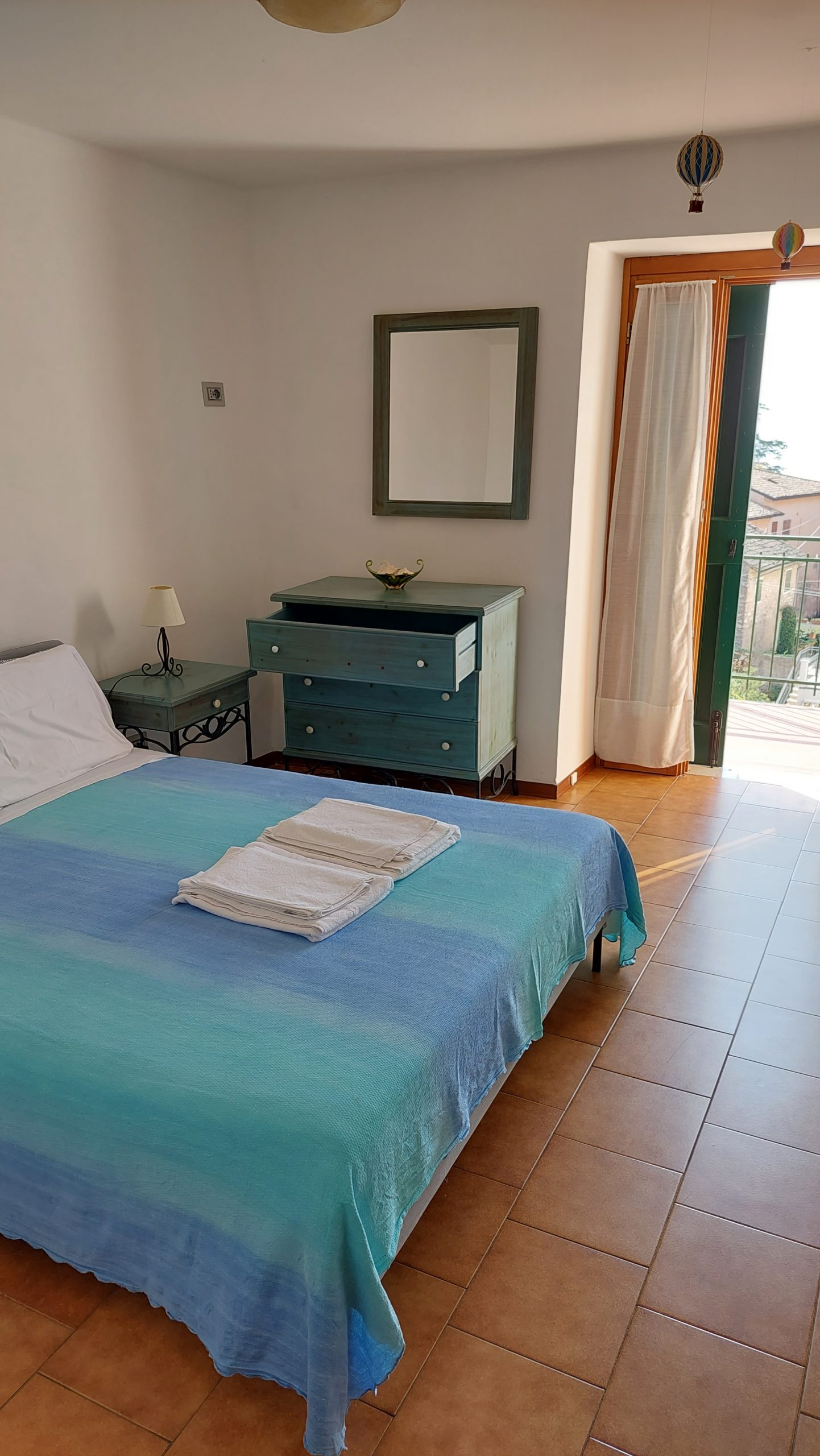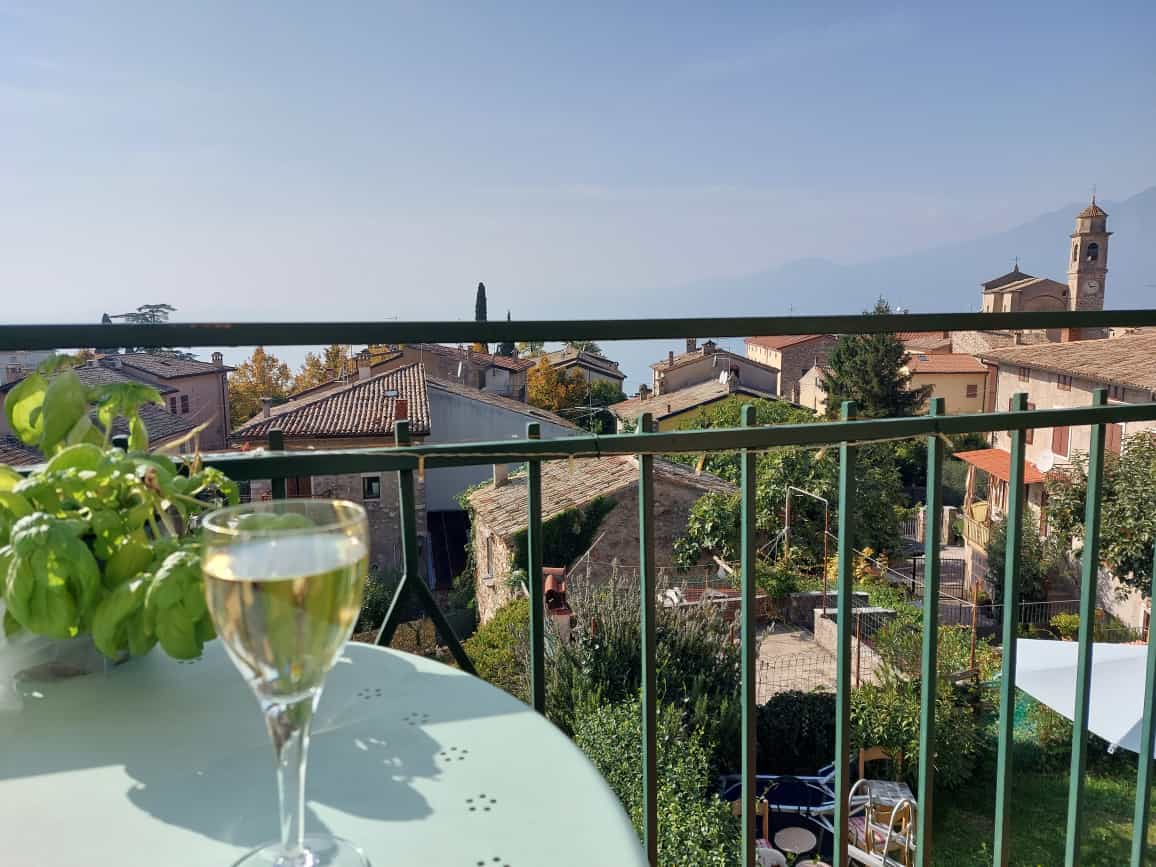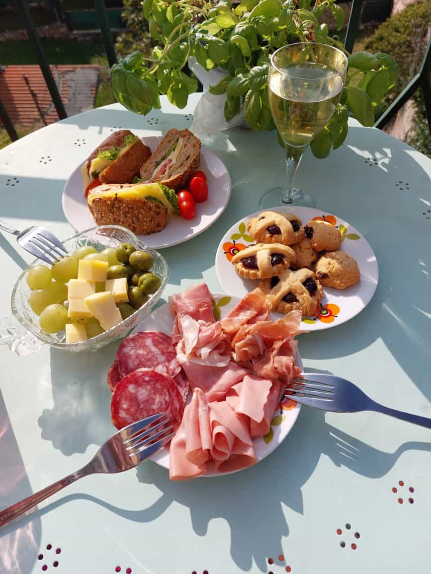 Morgens zeigte google noch recht viele Staus auf der Strecke nach Torri del Benaco an, die sich dann aber im Laufe des Tages nach und nach auflösten. So konnten wir die Fahrt durch die Alpen genießen und die Bergformationen, Apfelplantagen, die vielen Weinfelder bzw. -hänge und hin und wieder auch mal eine Burg(ruine) auf den Bergen ansehen. Direkt an der Abfahrt gab es gleich einen großen Supermarkt, der uns mit den nötigen italienischen Lebensmitteln versorgt hat. Von dort aus ging es dann die letzten 15 km über kleine Straßen direkt bis zur Ferienwohnung. Besichtigen, für gut befinden, auspacken und den Blick von der Terrasse genießen – die abgespulten 1.050 km haben sich gelohnt! Bei Sonnenschein gab es dann einen mediterranen Snack auf der Terrasse, man konnte noch sehr gut im T-Shirt draußen sitzen.