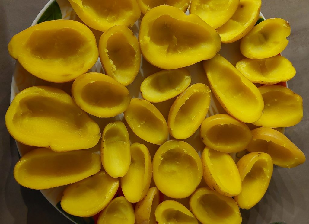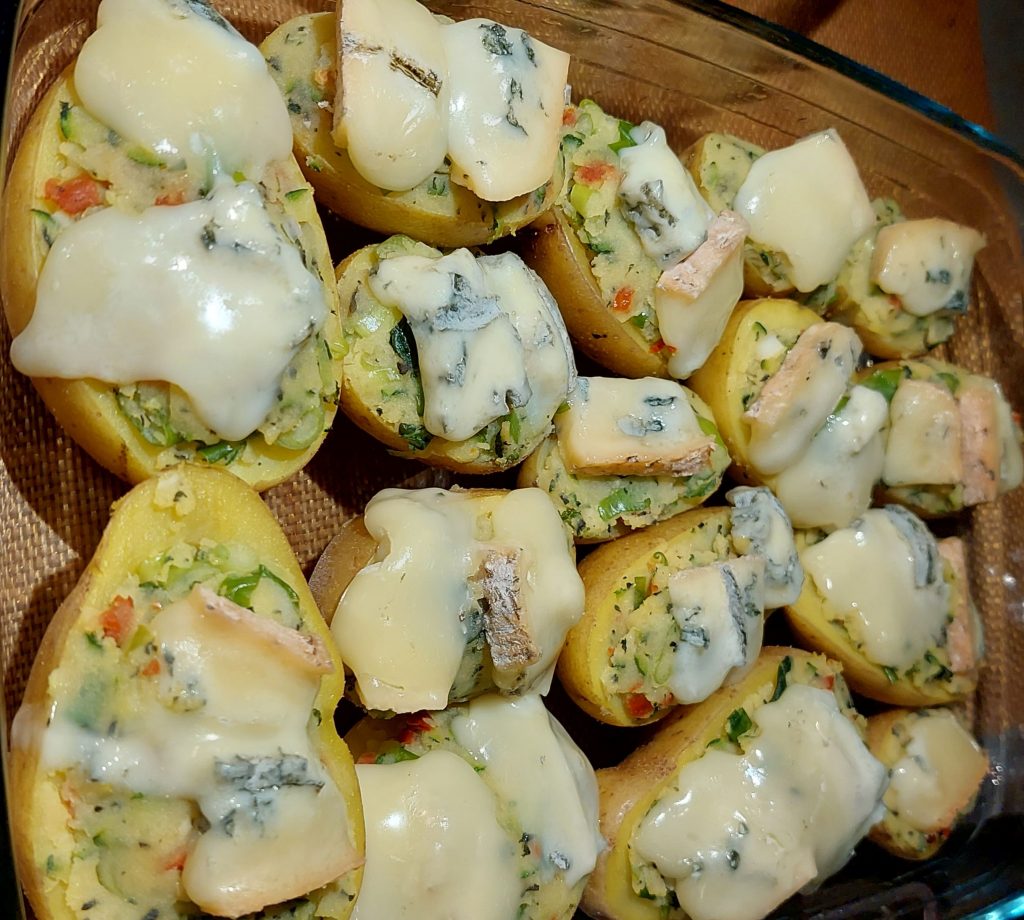 Die Kartoffeln mit dem Putzhandschuh oder einer Bürste gründlich waschen und 5 Minuten kochen, dann etwas auskühlen lassen und halbieren. Nun die Kartoffeln mit einem geeigneten Werkzeug aushöhlen. Ich habe dazu einen Apfelausstecher benutzt und bin damit ganz gut gefahren.