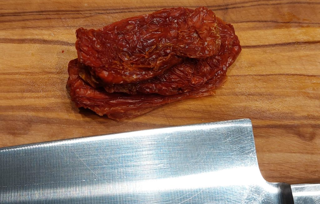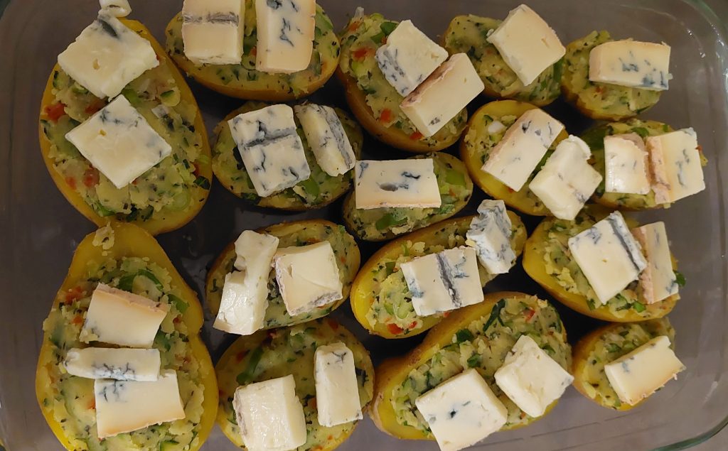 Das Innere der Kartoffeln noch einmal in Salzwasser kochen bis es richtig weich ist und durch die Kartoffelpresse geben. Die Zucchini waschen, halbieren, mit einem Löffel die Kerne entfernen und raspeln. Die Lauchzwiebeln in feine Ringe schneiden. Knoblauch, Chili, Kräuter und getrocknete Tomaten fein hacken. Knoblauch, Chili und die Zucchini kurz anbraten. Den Käse so schneiden, dass die Scheiben auf die Kartoffeln passen.