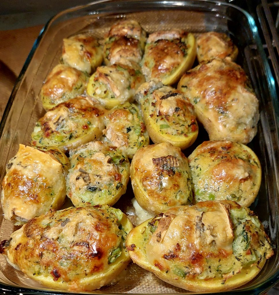 Zutaten gut vermischen und diese Masse in die Kartoffeln füllen, so dass ein kleiner Berg entsteht. Eine Auflaufform mit Olivenöl einfetten und die Kartoffeln hineinlegen. Die Käsescheibe obendrauf und ab in den Backofen. Bei 200 Grad Ober- und Unterhitze für 30-40 Minuten backen, bis der Käse verlaufen und braun ist.