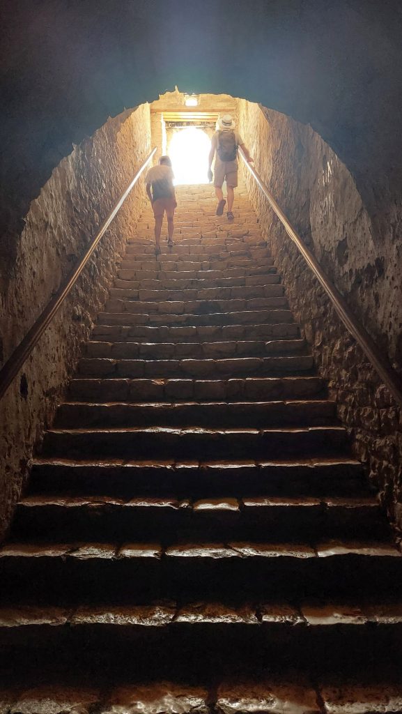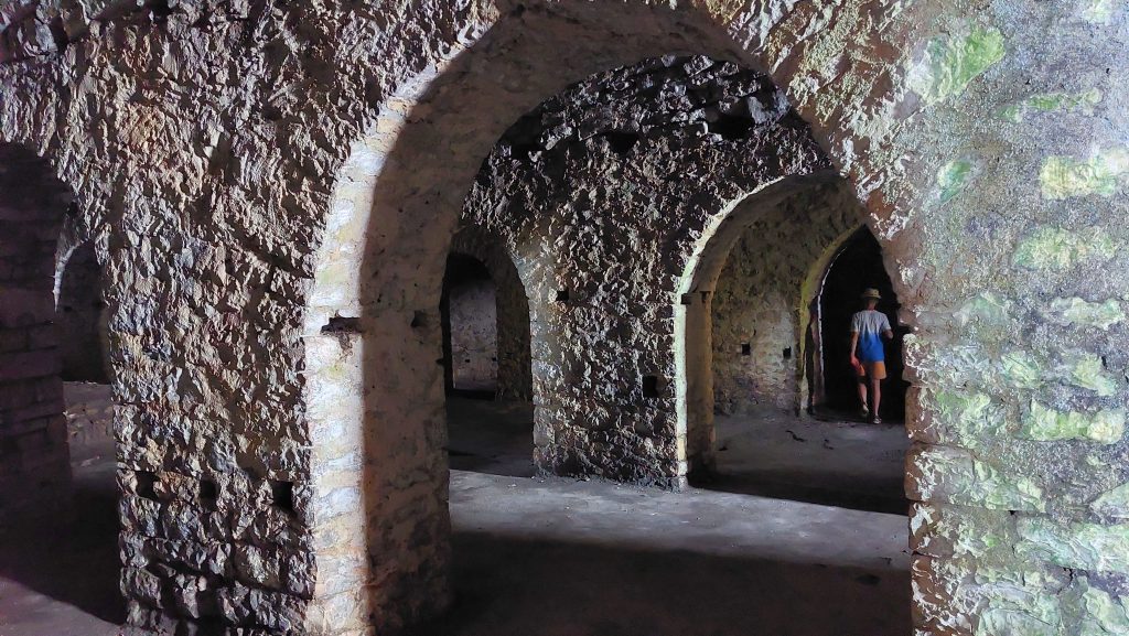 Auf dem Rückweg haben wir noch in Porto Palermo angehalten und uns die dortige Festung angesehen. Den Namen gaben die Italiener der Bucht während ihrer Besatzung und die dreieckige Festungsanlage selber wurde in der osmanischen Zeit von Ali Pascha errichtet. Das Gefängnis wurde sogar noch in der kommunistischen Zeit genutzt. Das Innere der Anlage ist sehr finster und hat schon einen gewissen Gruselfaktor. Auf künstliche Beleuchtung wird konsequent verzichtet und durch die spärlich vorhandenen Öffnungen dringt nur wenig Licht ins Innere.