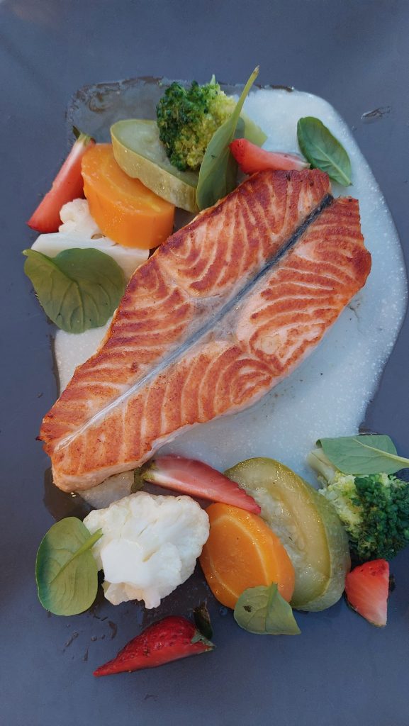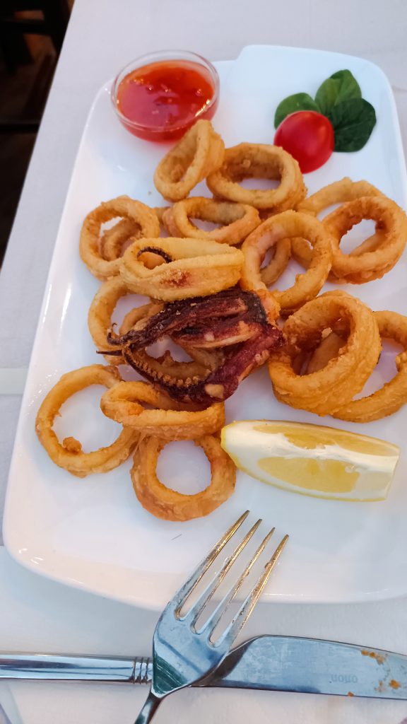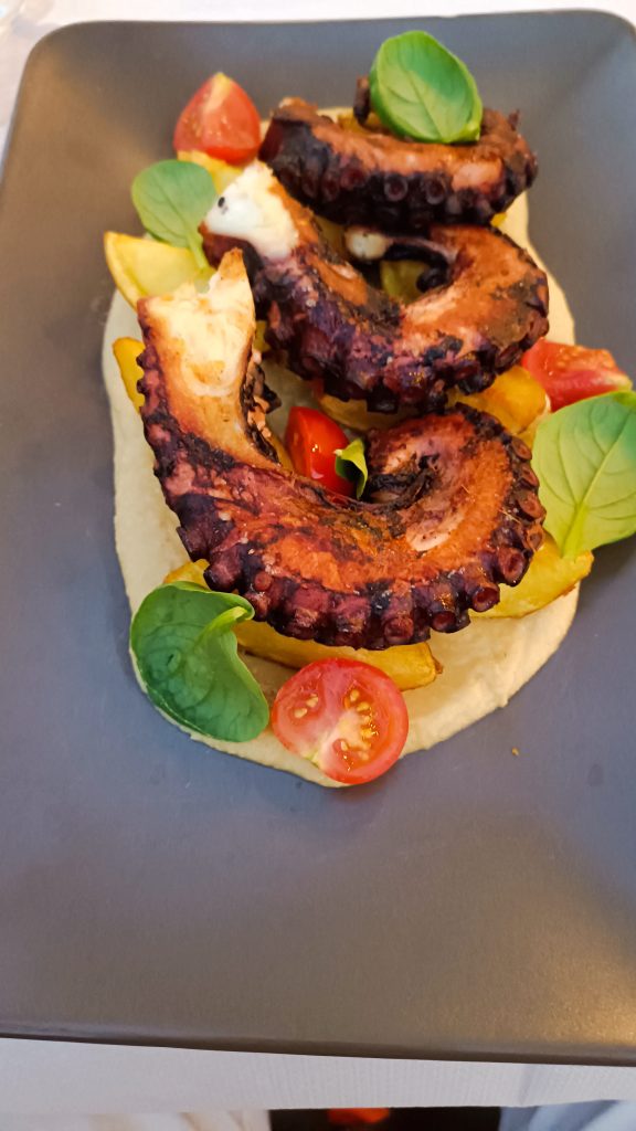 Danach gab es für den Junior Tintenfischringe, der Gatte hatte ein perfekt gebratenes Lachsfilet und bei bei mir gab es gegrillten Oktopus.