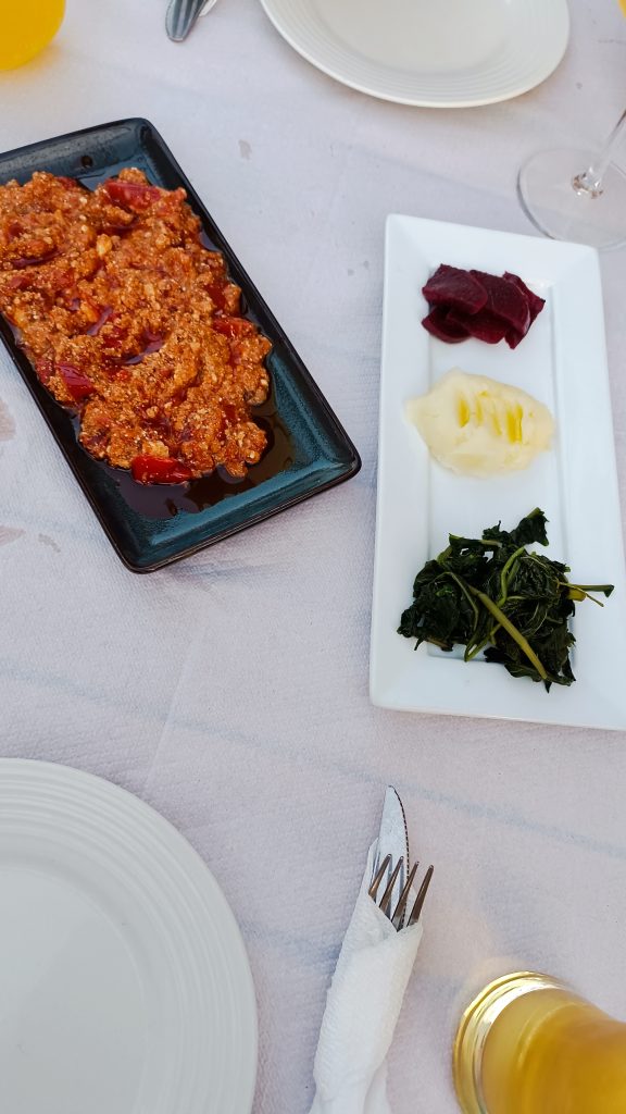 Nachdem wir die letzten beiden Tage bei einfachen Mahlzeiten in der Ferienwohnung geblieben sind, haben wir es heute mal wieder krachen lassen. In Lefteri’s Taverna haben wir uns eine typisch albanische Vorspeise mit Paprika und Salzlakenkäse, den Gruß aus der Küche für den Anfang schmecken lassen.