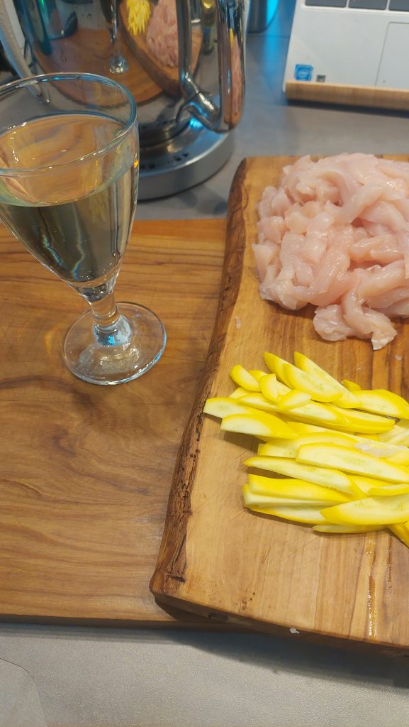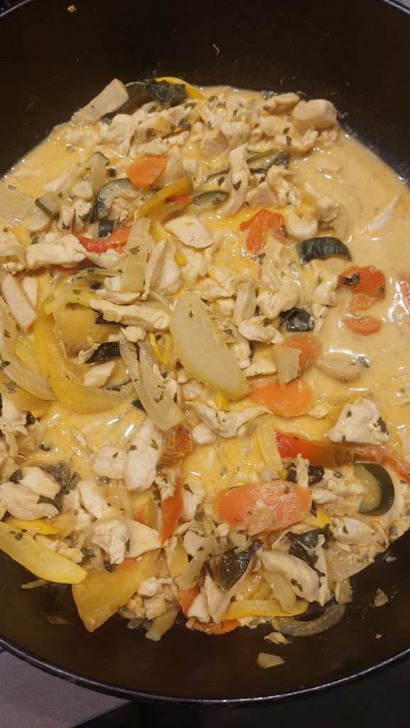 Zwiebel, Knoblauch und Ingwer in ganz feine Streifen schneiden oder fein hacken. Die Zucchini halbieren, die Kerne mit einem Löffel entfernen und in feine Streifen schneiden. Nun das Olivenöl in einer großen Pfanne auf mittlerer Stufe erhitzen und Zwiebel und Knoblauch darin anschwärzen. Nach 4 Minuten den Zucker hinzugeben und karamellisieren lassen. Anschließend das Hähnchenfleisch anbraten und dann die Zucchini und den Ingwer dazugeben. Nun löschen wir das ganze mit dem Weißwein ab und rühren die saure Sahne und die Currypaste unter, 10 Minuten köcheln lassen und mit etwas Salz abschmecken. Durch die Currypaste bekommt das Gericht schon eine schöne Schärfe. Wer mehr davon benötigt, würzt mit Chili oder Pfeffer nach.