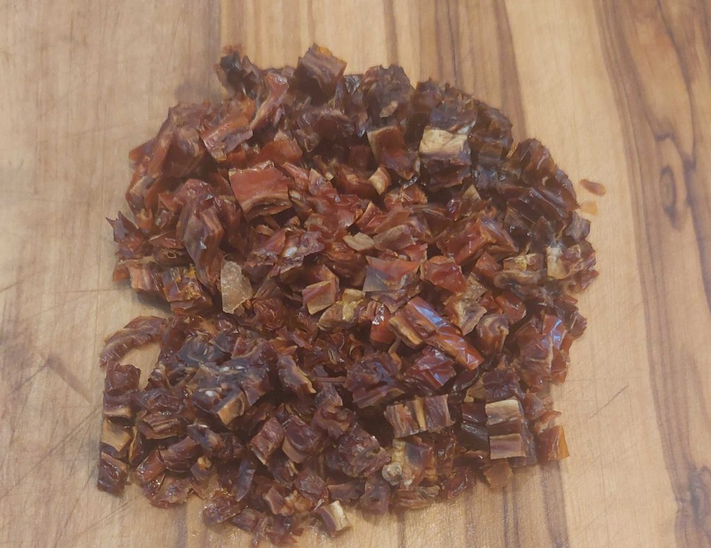 Jetzt soll der Teig noch einmal für mindestens 2 Stunden ruhen. Für die Alternative können wir in der Zwischenzeit die getrockneten Tomaten in feine Würfel schneiden.