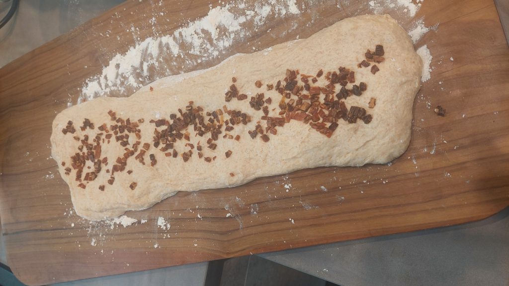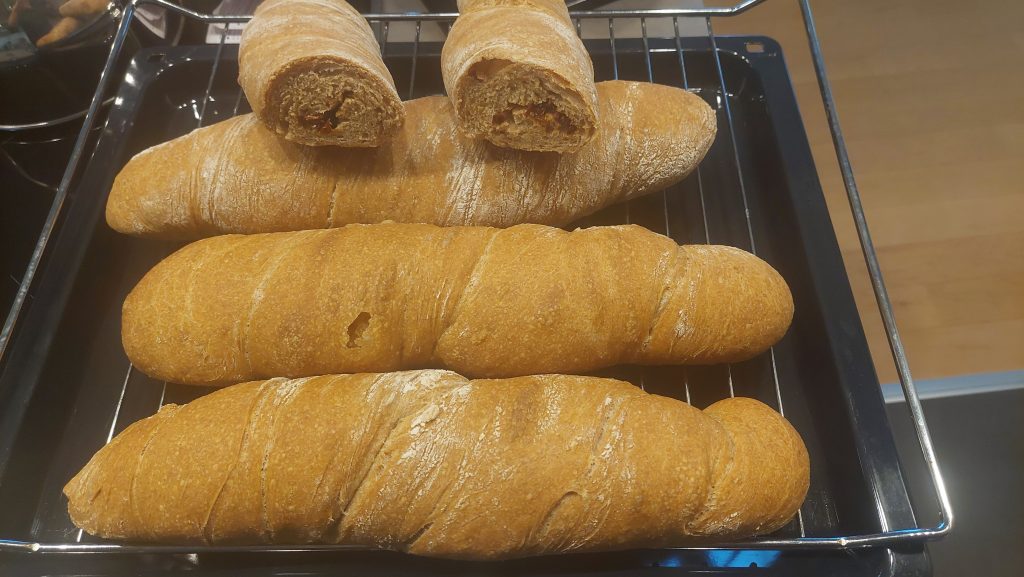 Nach der zweiten Reifephase wird der Teig vorsichtig aus der Schüssel gehoben und in vier gleich große Portionen aufgeteilt. Dies soll mit möglichst wenig Druck geschehen, damit die Luft im Teig bleibt. Die Teiglinge werden nun vorsichtig mit der Hand in eine rechteckige Form gezogen. Für die Tomatenvariante können jetzt die getrockneten Tomatenwürfel auf den Teig gestreut werden, anschließend wird dieser zu einer Rolle verarbeitet. Jetzt verdrehen wir die Teigrolle ineinander und lassen diese nochmal eine Stunde mit einem feuchten Tuch abgedeckt ruhen. Der Backofen wird auf 215°C vorgeheizt und die Baguettes ca. 25 Minuten mit Dampf (wer hat Stufe 3, sonst reichlich mit der Sprühflasche arbeiten) gebacken.