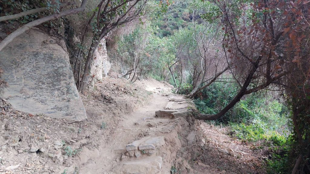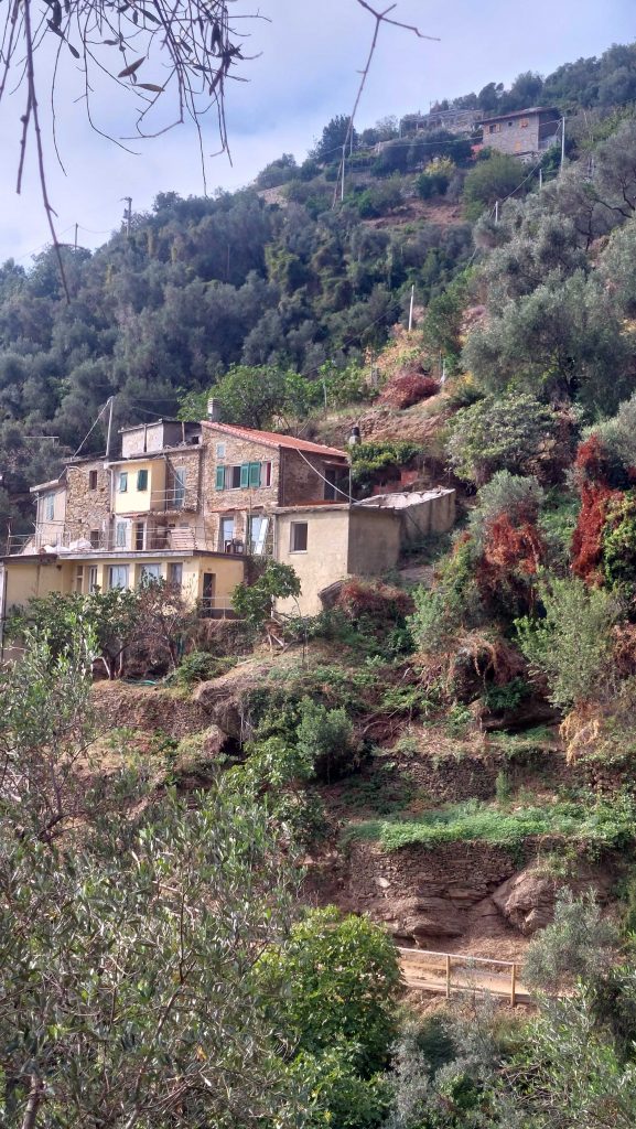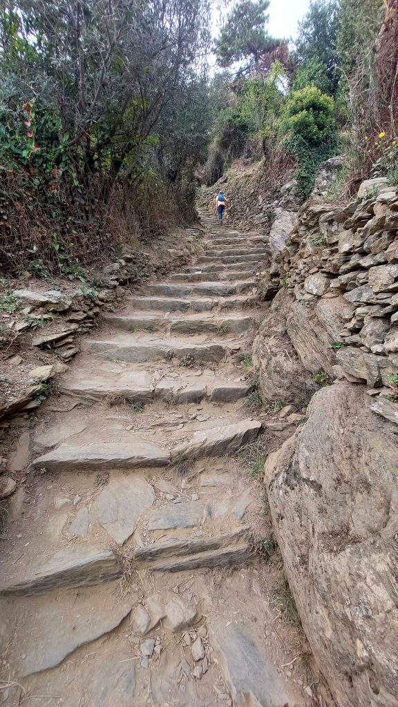 Die Strecke ist ausgeschildert und es geht gleich zum Anfang mit einem ordentlichen Aufstieg los. Von Monterosso nach Vernazza müssen 200 Höhenmeter überwunden und eine Strecke von 3,7 km gemeistert werden. Dabei nimmt man ca. 743 Treppenstufen in jeder Richtung, wie uns eine des Zählens mächtige Wanderin am Ende unserer Tour freundlicherweise mitteilte Der Weg (Monterosso bis Corniglia) ist kostenpflichtig und dafür, dass man noch selbst laufen muss, mit 7,50 € pro Nase und Tag kein Schnäppchen. Kleinere Kinder sind kostenlos, die haben aber auch keine Lust den Weg zu laufen, so dass eine Bestechung mit Eis oder vergleichbar nötig ist, um die Motivation aufrechtzuerhalten. (Diese Information bekamen wir bei einem Fotostopp von einem motivierenden Familienhäuptling.) Auf jeden Fall sollte man etwas Kondition mitbringen und auch vernünftiges Schuhwerk schadet nicht. Auf dem Weg passiert man einige Weinhänge und auch Olivenhaine und hat immer wieder einen tollen Blick auf das Mittelmeer und die Küste. Selbstverständlich kann auch der Hang der italienischen Bergbevölkerung beobachtet werden, dort Häuser in oder an den Berg zu kleben, wo sich kein Mensch hin traut. Auf jeden Fall wohnt man sehr ruhig und vielleicht auch sicher, ohne eine Armee oder einen Sicherheitsdienst zu beschäftigen.
