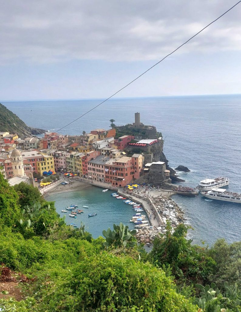 Nach ungefähr zwei Drittel der Strecke ist Vernazza schon gut zu sehen, es dauert aber noch, bis man dort angekommen ist. Die eine oder andere Stufe möchte noch betreten werden. Der Ort selbst hat eine kleine Bucht mit Hafen und auf der kleinen Promenade kann man gut sitzen, die Beine ins Wasser hängen und seine Panini verzehren. Selbstverständlich gibt es auch reichlich Gastronomie dort. Die Preise sind ordentlich, deshalb haben wir die Variante Selbstverpflegung bevorzugt.
