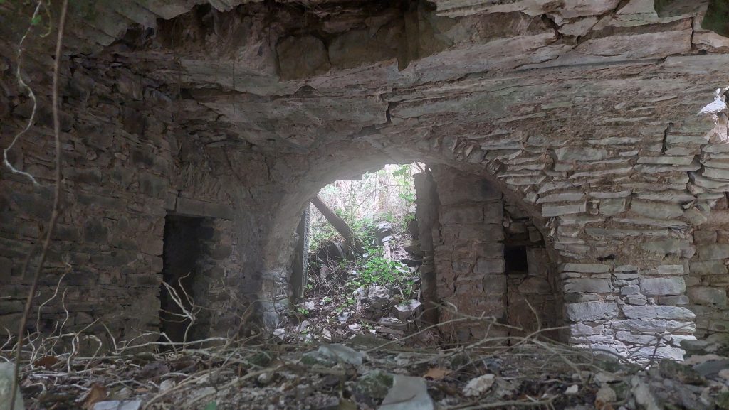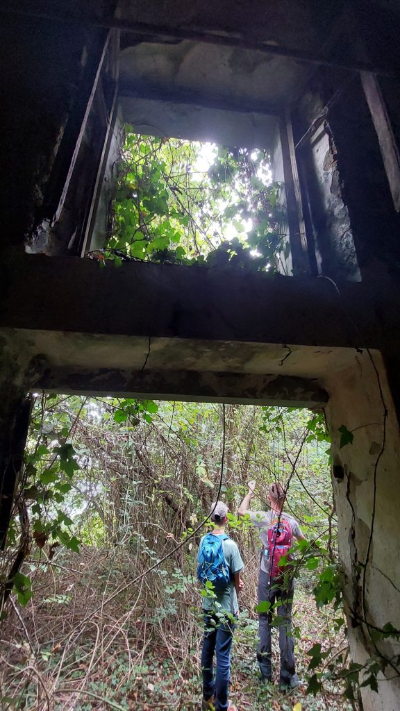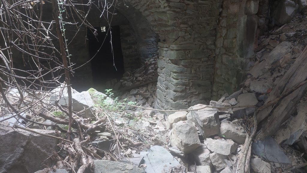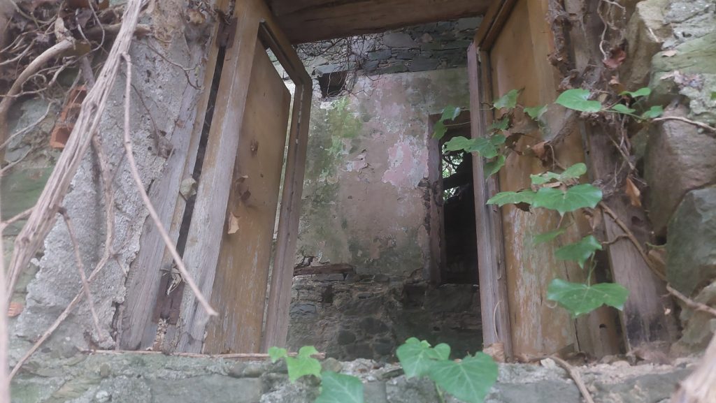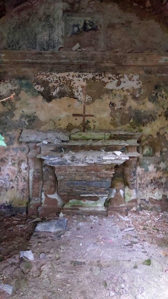 Die noch erhaltenen Häuser muss man schon suchen, die Natur ist wirklich kräftig am Arbeiten, um die Gebäude wieder zu vereinnahmen. Man muss schon die Augen wirklich offen halten, sonst rennt man einfach an den Häusern vorbei. Den Weg zu den Gebäuden mussten wir uns teilweise hart erarbeiten, denn Pflanzen und davon einige mit Dornen haben versucht, uns von einer Besichtigung abzuhalten. Aber keine Chance! Wir haben es geschafft, die Überreste der Gebäude unter die Lupe zu nehmen. Das Dorf war nicht sonderlich groß, aber selbstverständlich gab es auch dort eine Kapelle – Kreuz und Altar waren noch vorhanden.