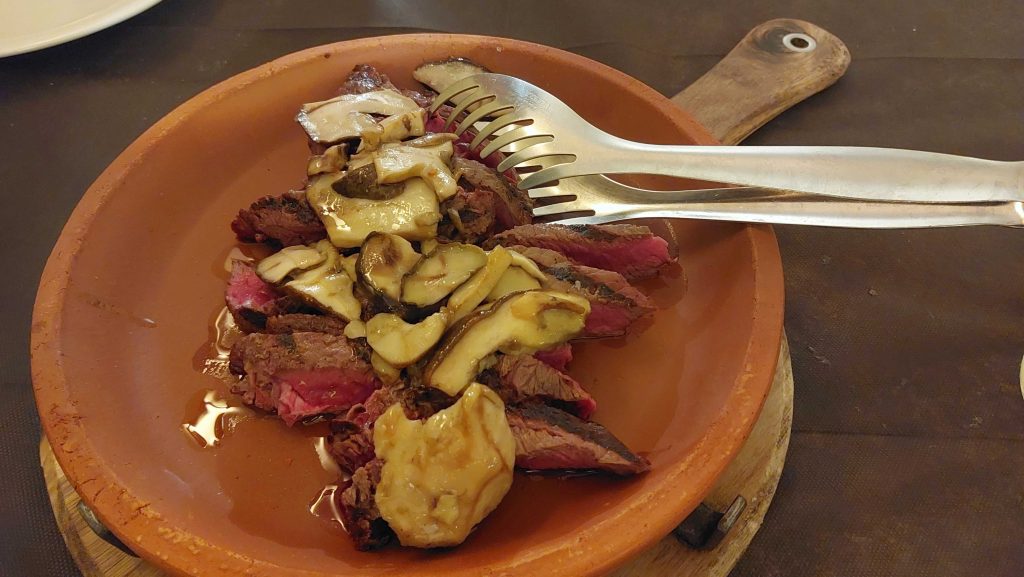 Der Gatte bekam dann Nudeln (wen wundert’s) mit Pilzen, bei mir gab es Pilzsuppe und der Junior bekam Ravioli. Weiter ging es dann mit einer Tagliata, natürlich mit Pilzen – das Fleisch war wirklich auf den Punkt und mundete uns allen.