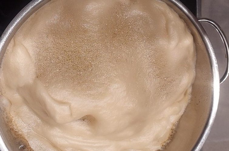 Die Hefe im Schwarzbier auflösen. Zucker oder Honig benötigen wir bei diesem Rezept nicht, das Bier bringt genug Energie mit. Die Zutaten dann wie immer mit dem Küchengerät eurer Wahl vermischen: Es ist ein leichter Teig, da tut es auch ein großer Löffel oder ein Handrührgerät. Nach der zweistündigen „Anspringphase“ bei Zimmertemperatur wird der Vorteig noch einmal von außen in die Schüsselmitte gefaltet und dann im Keller oder Kühlschrank für mindestens 12 Stunden zum Ruhen und Pupsen untergebracht.