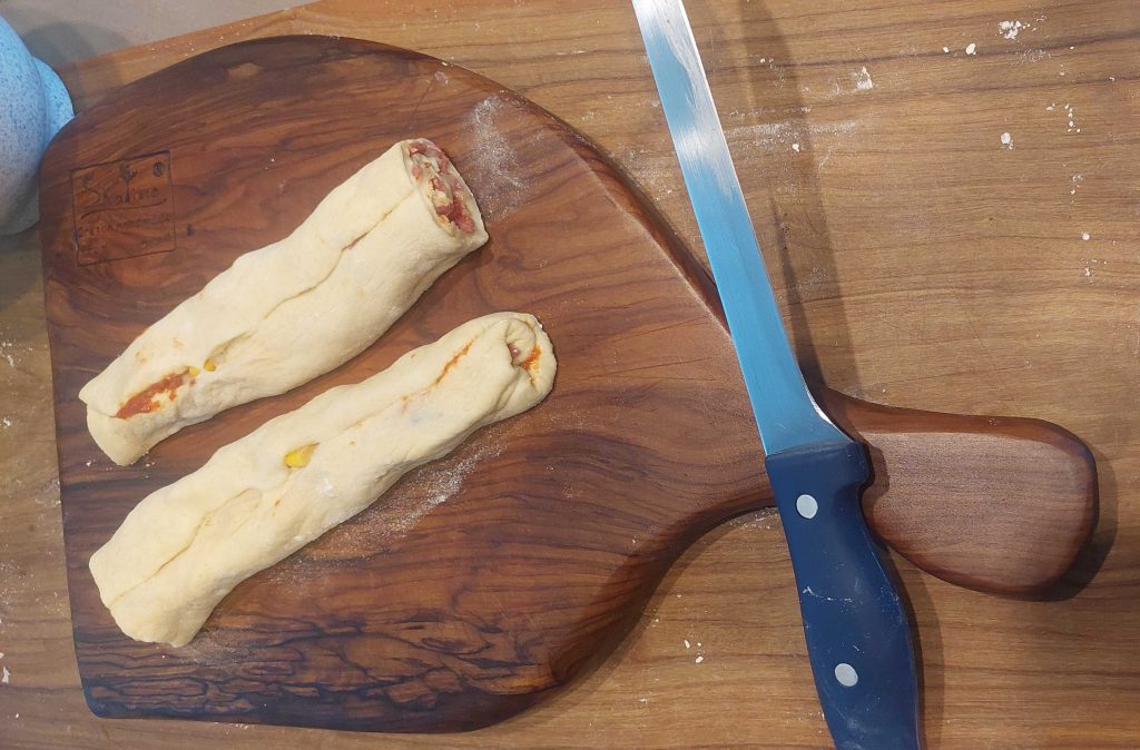 Anschließend die Teigplatte mit Tomatensoße bestreichen und mit der Füllung gleichmäßig belegen. Den Teig aufrollen und mit einem scharfen Messer in dünne Scheiben schneiden.
