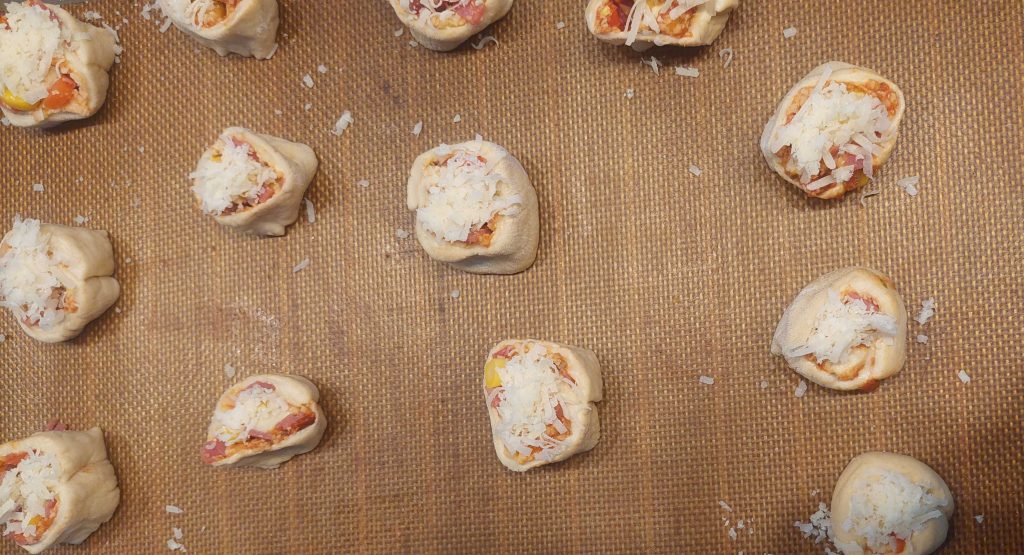 Diese optional noch einmal mit etwas Käse bestreuen und dann bei 180° Ober- und Unterhitze 15-20 Minuten backen, bis die Pizzaschnecken goldbraun sind.