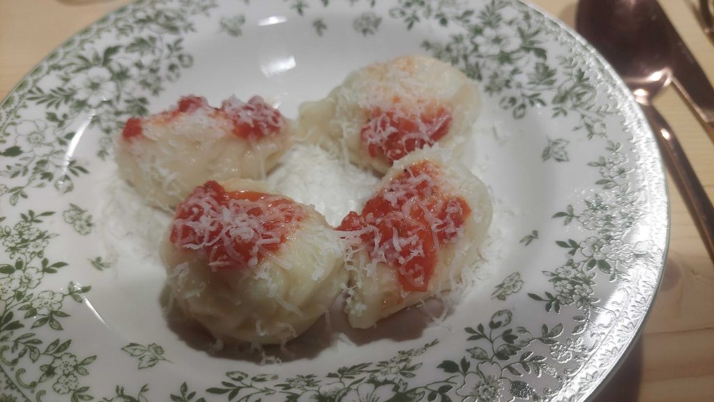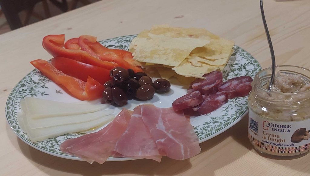 Kulinarisch waren wir heute in einem der örtlichen Supermärkte unterwegs und haben uns Culurgionis aus einer örtlichen Manufaktur besorgt. In Deutschland nähe ich diese mit Kartoffeln, Pecorino und Minze gefüllten Teigtaschen auch selbst, hier, am Ort des Geschehens, greife ich aber auch gern auf lokale Spezialisten zurück. Vorweg gab es noch Antipasto Misto, die wir uns nach gestrigem Vorbild selbst zusammengestellt haben.