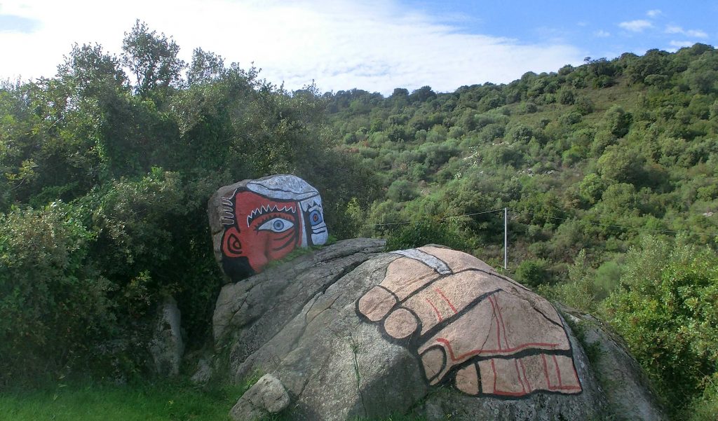 Nach unserer gestrigen Wanderung mussten wir heute unsere Muskeln etwas schonen und haben uns zu einer Sightseeing-Tour in der Barbagia aufgemacht. Auf dem Weg nach Orgosolo haben wir einen ganz kurzen Zwischenstopp bei einer „Felsenmalerei“ eingelegt. Dieser lag selbstverständlich in der Kurve einer Bergstraße, also mehr als anhalten, Foto aus dem Auto schießen war einfach nicht drin.