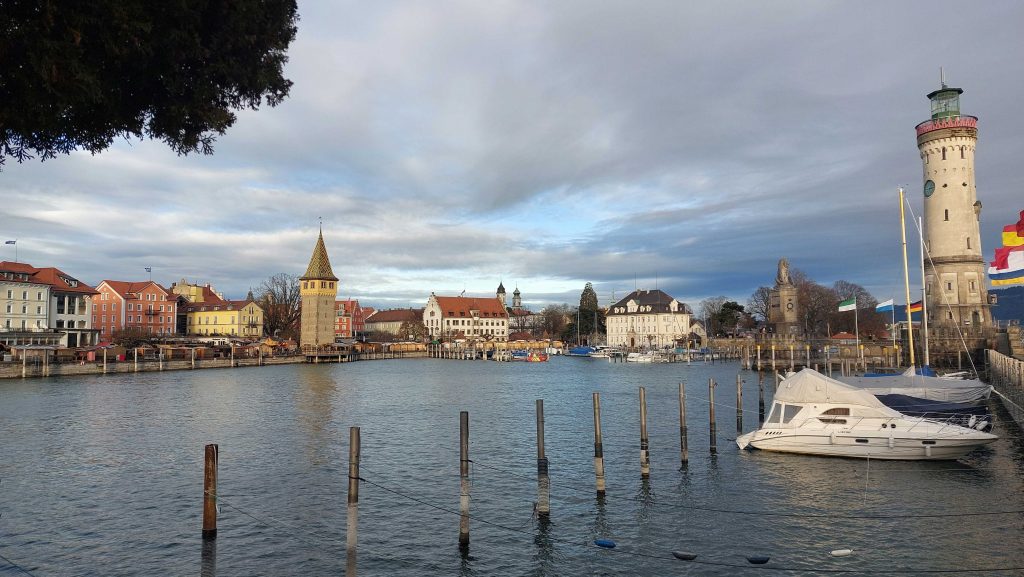 Damit wir nicht endlos im Auto sitzen müssen, hatten wir zwei Übernachtungen in Deutschland eingeplant. Der erste Stopp nach 400 km in der Nähe von Würzburg, mit der Option vor der Weiterfahrt noch eine kurze Besichtigung des Residenzschlosses einzuschieben. Da der Gatte aber gesundheitlich angeschlagen war, musste dieser Plan verworfen werden und wir sind gleich nach Lindau am Bodensee gestartet. Dort haben wir zumindest den Touri-Spot „Hafen mit Blick auf See und Alpen“ absolviert – mehr war einfach nicht drin.