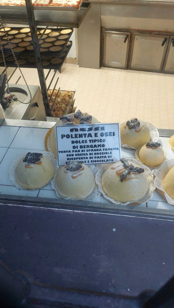 Bergamo hat eine alte Oberstadt und eine neuere Unterstadt. Mit Bus und Standseilbahn haben wir die Oberstadt erreicht und haben erst einmal einen Rundgang um die Burg gemacht. Da es an diesem Tag unbedingt nieseln musste, war die Tour nicht sonderlich gemütlich und fiel dementsprechend kurz aus. Beim Erwerb der für Bergamo typischen Leckerei POLENTA E OSEI konnten wir uns etwas aufwärmen.