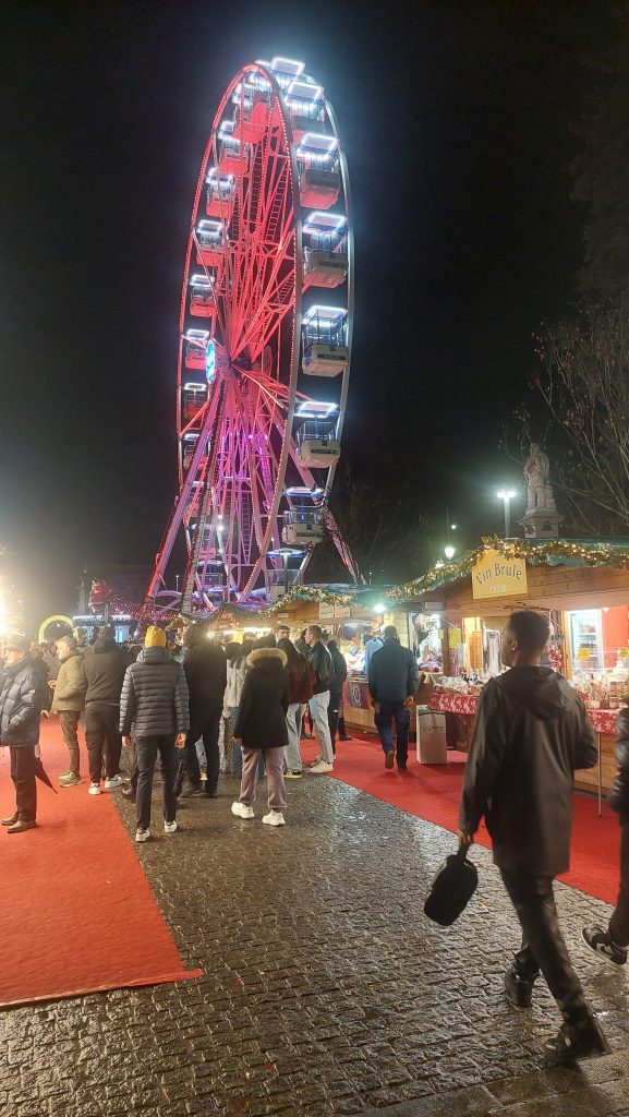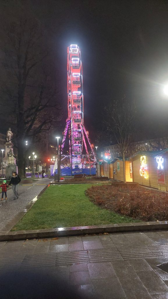 Nach einem Zwischenstopp in der Ferienwohnung haben wir uns dann auf den Weg zu den Weihnachtsmärkten gemacht. Laut Internet sollte der in Richtung Bahnhof befindliche der ursprünglichere und schönere sein, aber es handelte sich nur um eine Ansammlung von ungefähr 15 bis 20 Hütten mit Socken und diversen Fressbuden – also nicht so das, was wir unter einem Top-Ten-Weihnachtsmarkt verstehen würden. Also auf zum zweiten Markt in Richtung Oberstadt. Hier gab es zwar ein Riesenrad, aber ansonsten das gleiche wie bei Nummer eins.