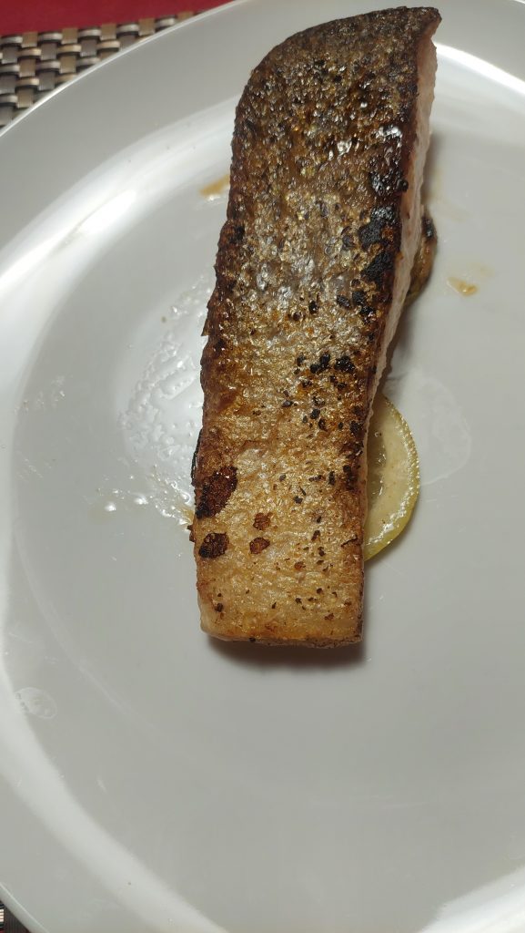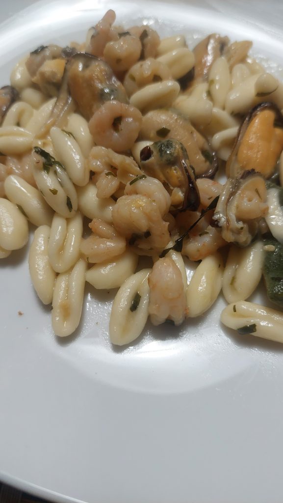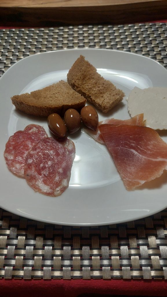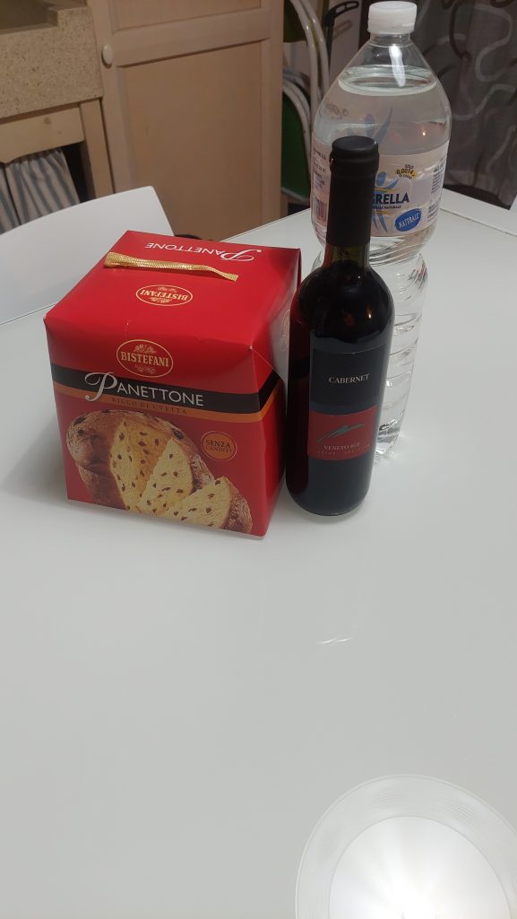 Wir haben uns die Zeit an den Feiertagen mit Erkundungsspaziergängen durch das Städtchen und Gesellschaftsspielen vertrieben und uns zumindest beim Festmenü an die örtlichen Gepflogenheiten angepasst. Also gab es am 24. ein bis auf die Vorspeise fleischloses Drei-Gänge-Menü. Bei den Antipasti waren noch Schinken und Salami am Start, zum Primo gab es Pasta mit Meeresfrüchten und als Secundo kross gebratenen Lachs. Das Dessert wurde in Form einer Panettone von unseren Gastgebern gesponsert.