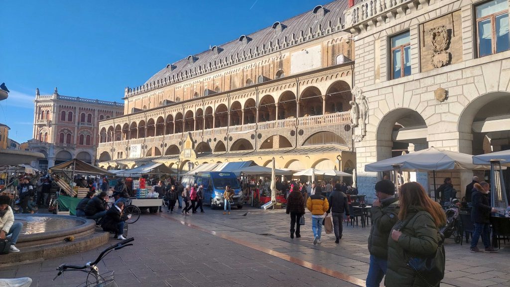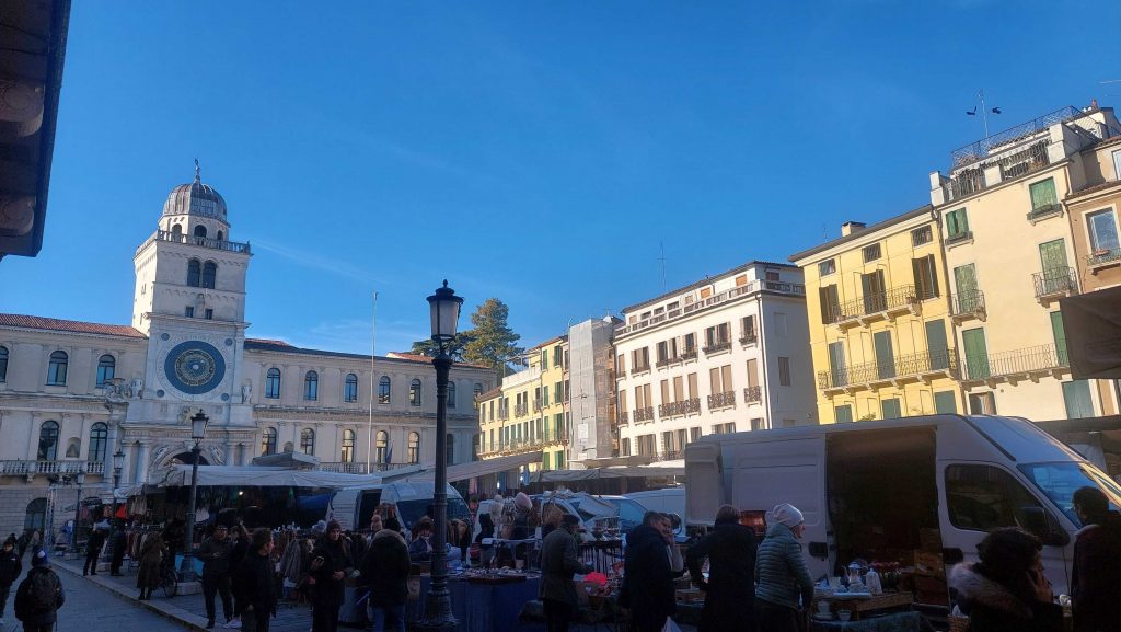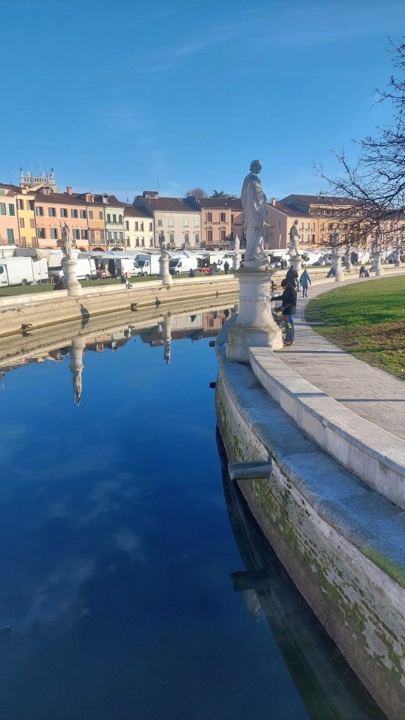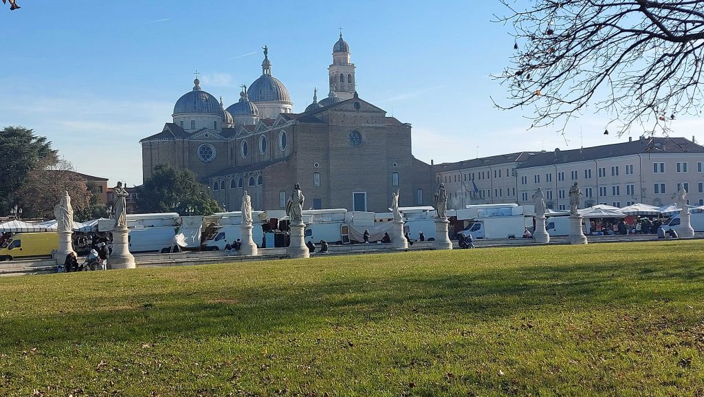 Im südlichen Zentrum gibt es auch einen riesigen Platz, den Prato Della Valle. Dieser ist römischen Ursprungs und mit seinen 90.000 m² einer der größten innerstädtischen Plätze Europas. Heute hatten sich rings herum lauter Textilverkäufer angesammelt, die den Platz mit ihren Verkaufswagen komplett eingekreist hatten.