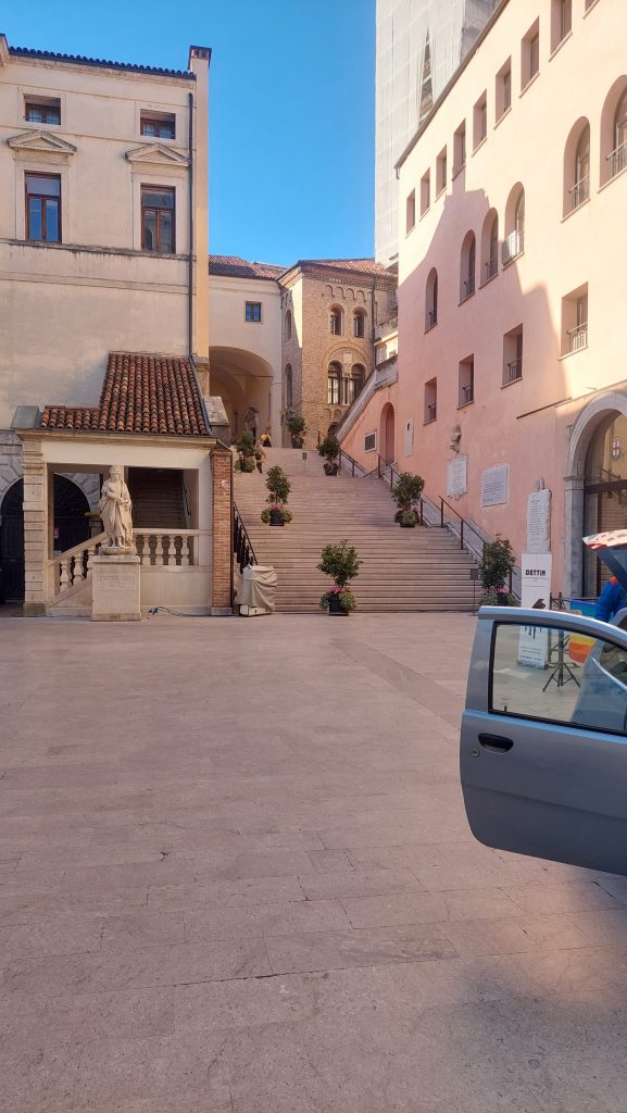 Nachdem wir uns gestern in der ländlichen Gegend aufgehalten hatten, nun auf nach Padua, einer alten Universitätsstadt und nur eine knappe halbe Stunde von Dolo entfernt. Am geplanten Parkhaus angekommen, erst einmal etwas Chaos, denn es wurde als belegt angezeigt. Nach einigen Minuten Wartezeit konnten wir aber doch einfahren und – Überraschung – es gab sogar freie Ladesäulen, die wir natürlich gleich in Anspruch genommen haben.