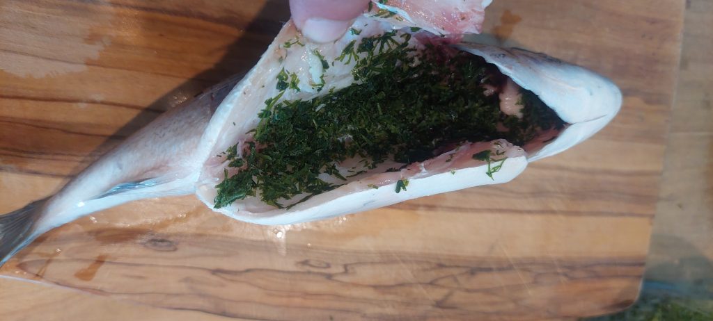 Den oder die Fische gründlich unter fließendem kalten Wasser abspülen und an den Seiten mehrfach einschneiden. Im Bauch einen Teelöffel frischen Dill verteilen und den Fisch dann auf ein entsprechend großes Kartoffelstück setzen.