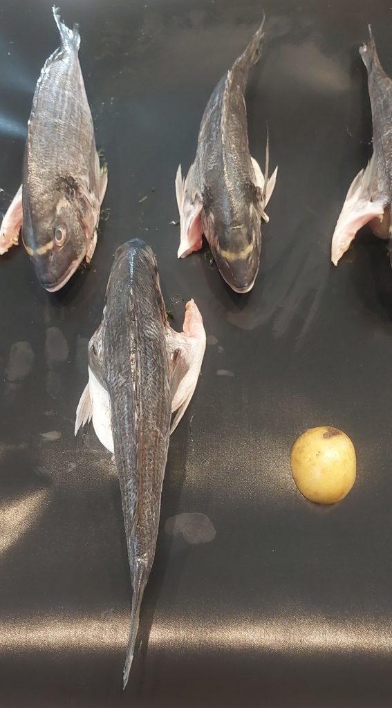Den Backofen auf 200° Ober-/Unterhitze vorheizen und den Fisch für 20 Minuten darin verweilen lassen. Die Dorade ist gar, wenn sich die Rückenflosse leicht herausziehen lässt, oder ihr verwendet einfach ein entsprechendes Thermometer.