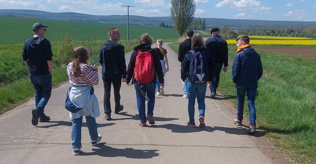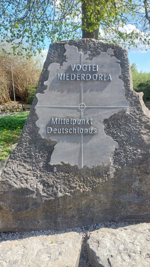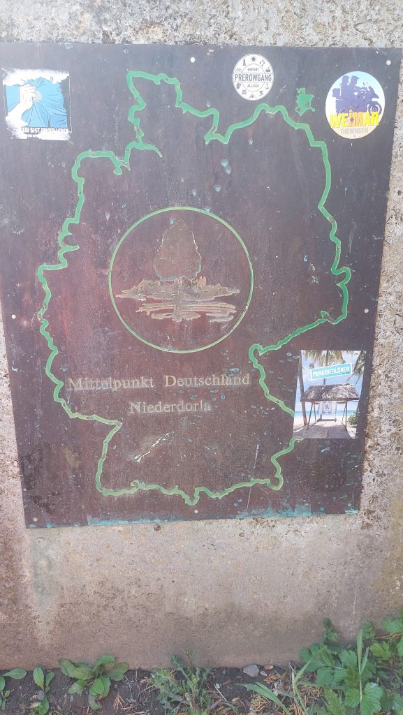 Am Folgetag gab es dann eine Wanderung zum Mittelpunkt Deutschlands uns zum Opfermoor Niederdorla – eine historische Ausgrabungsstätte. Beides liegt direkt nebeneinander und kann hervorragend kombiniert werden. Hin und Rückweg sind ungefähr acht Kilometer und man läuft auf landwirtschaftlichen Nebenstraßen und bei gemütlicher Geschwindigkeit benötigt man ungefähr 45 Minuten bis dorthin.