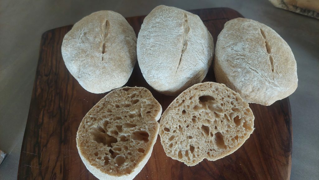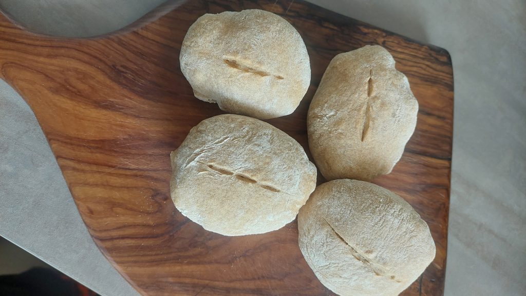 Den Backofen nach Möglichkeit mit einem Pizzastein bestücken und auf 210 °C Ober-/Unterhitze vorheizen. Anschließend dann die Teiglinge auf die gewünschte Größe abstechen (ca. 80-100g). Brötchen nach Wunsch formen: Ich forme zuerst eine kleine Rolle und benutze danach ein Nudelholz mit Abstandshaltern (10mm). Die Rohlinge noch einmal mit einem feuchten Tuch abgedeckt 30 Minuten gehen lassen, danach einschneiden und noch einmal 15 Minuten gehen lassen. Auch hier wieder mit einem feuchten Tuch abdecken um zu vermeiden, dass die Brötchen eine Haut bekommen.