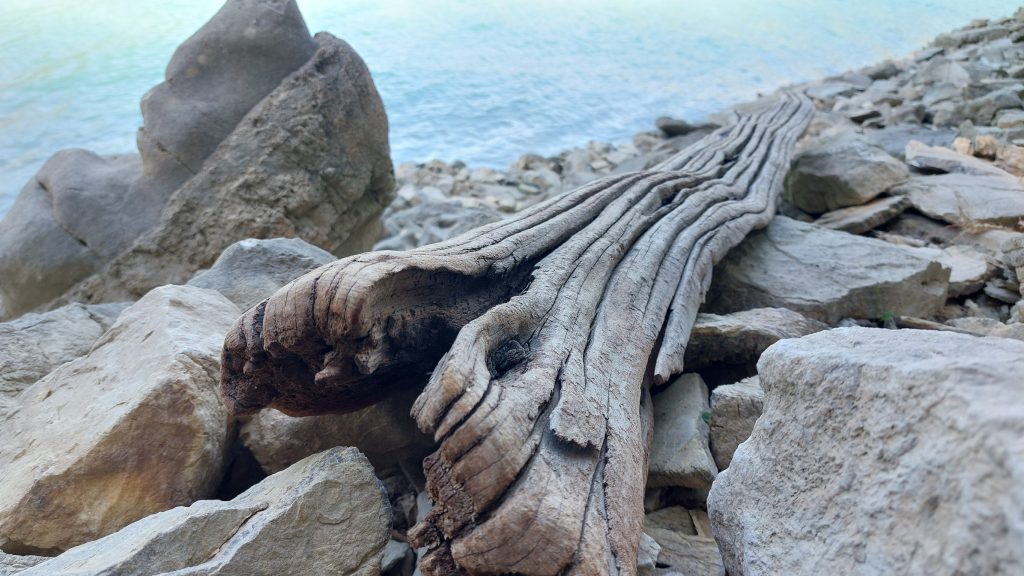 Wir haben dann die Mittagshitze abgewartet und am Nachmittag noch eine kleine Wanderung am See gemacht. Die Routen-App wollte uns an der Straße entlang schicken, ich wollte aber lieber am Wasser laufen, also wurde aus der Wanderung eine Kletterpartie. Dicht am Wasser gibt es leider keinen Weg, sondern nur Geröll und Felsen. Auf diese Weise haben wir eine Stelle gefunden, wo wir abseits des Mainstreams ohne Badehose ins Wasser gehen konnten. Nach einem abenteuerlichen Aufstieg und einer kurzen Runde mit der Drohne, haben wir dann den Rückweg brav am Rand der Straße absolviert.