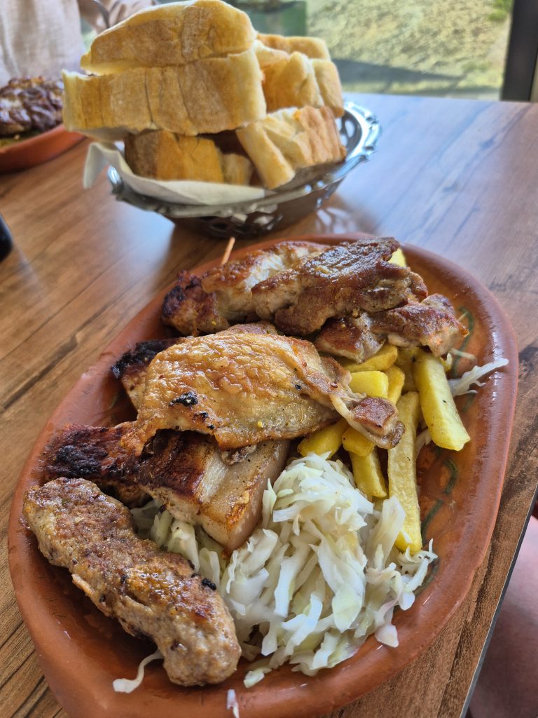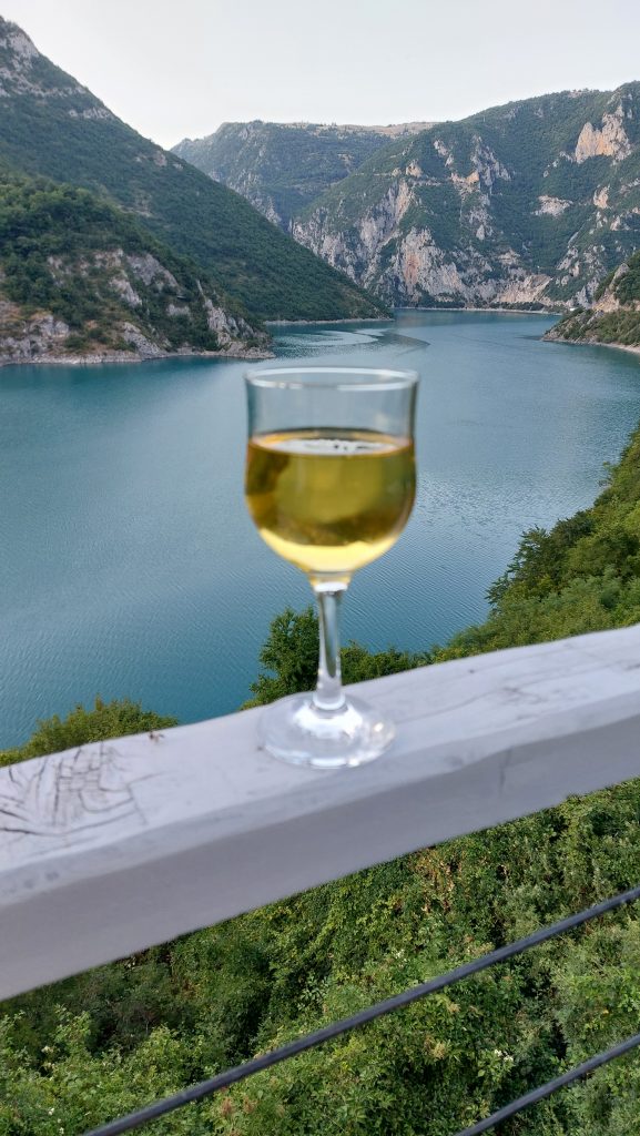 Vor Ort hatten wir dann noch etwas Zeit bis zum Einzug. Also, auf zum Pivsko See, unserem direkten Nachbarn, und mit einem kalten Fußbad die Müdigkeit aus den Knochen vertreiben. Da die Supermärkte hier am Sonntag geschlossen haben, waren wir praktischerweise gezwungen, uns auswärts um Nahrung zu bemühen. Passenderweise gibt es einen Grillimbiss in drei Minuten Entfernung, den wir dann auch aufgesucht haben. Für etwas über 30 Euro haben wir dort drei ordentliche Fleischportionen bekommen, sogar unser fast 16-Jähriger musste kämpfen, um seine länglichen Frikadellen, die hier Cevapi heißen, zu vertilgen. Anschließend haben wir noch die Terrasse der gegenüberliegenden Bar besucht und mit einem tollen Blick auf den See noch das eine oder andere Kaltgetränk zu uns genommen.