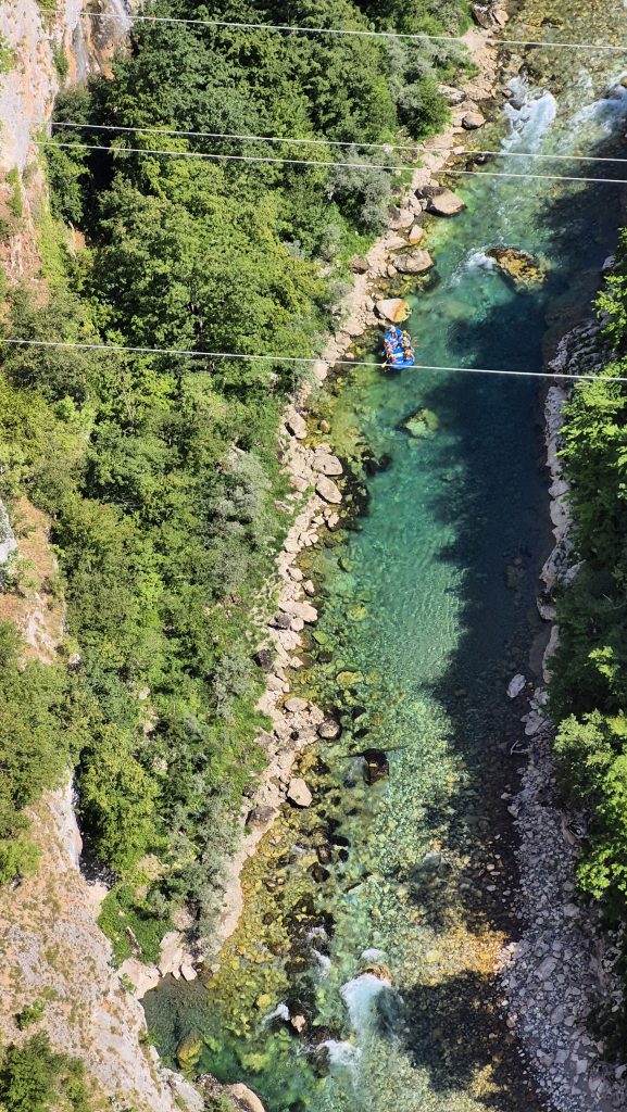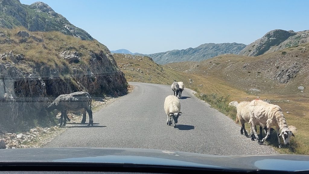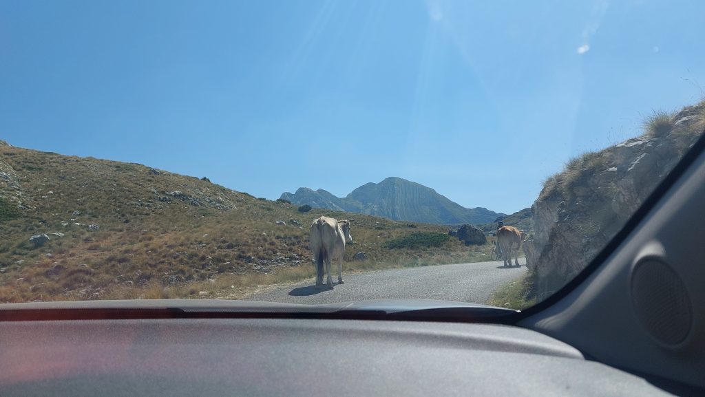 Heute war die Tara-Schlucht unser Ziel. Über diese hatten wir schon zahlreiche beeindruckende Dokus gesehen. Was dort aber nicht erwähnt wurde: Die Anreise durch den Durmitor Nationalpark ist genauso spannend. Es geht durch Tunnel die Berge hinauf und recht schnell wird die Straße eng, also saueng. Ich habe immer gehofft, dass kein Gegenverkehr kommt, aber das war umsonst – der kommt so sicher wie das Amen in der Kirche. Die Landschaft dort ist absolut beeindruckend: karge Flächen, umringt von den großen Gebirgszügen. Der Fahrer sollte zum Staunen lieber eine Pause einlegen, sonst geht die Sache mit dem Gegenverkehr schief. Generell schafft man es immer irgendwie aneinander vorbei zu kommen, aber es ist schon herausfordernd.