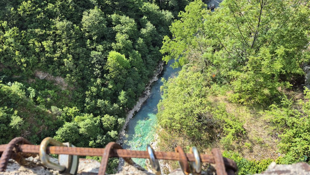 Und weil wir schon einmal da waren, haben wir gleich noch einen Ausflug zur Đurđevića-Tara-Brücke drangehängt. Diese ist ca. 150 m hoch, wurde 1940 erstmalig in den Dienst gestellt und überspannt die Schlucht auf ca. 365 m Länge. Teilweise sind Menschenmengen auf der Straße, dass eine Weiterfahrt nur schwer möglich ist. Wer besonders angstbefreit und schwindelfrei ist, kann auch parallel zur Brücke einen Flug mit der Seilbahn unternehmen, leider nix für uns, wir sind da Angsthasen.