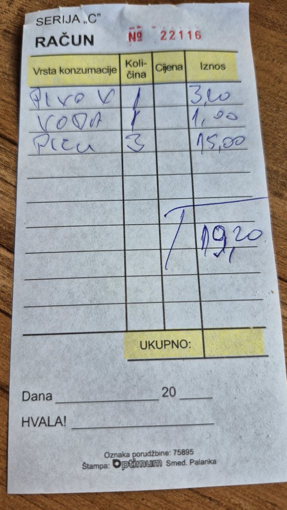 Für die Kulinarik musste wieder der Grillimbiss herhalten, heute wurden die Pizzen getestet. Diese waren natürlich nicht vergleichbar mit den italienischen Originalen, eher eine eigenwillige Balkaninterpretation und dementsprechend gehaltvoll. Kann man mal probiert haben, Wiederholung nicht nötig. Der Preis war absolut okay: 15 Euro für drei Pizzen; 4,20 Euro für zwei Bier und ein Wasser, mehr ist dafür sicher nicht drin.