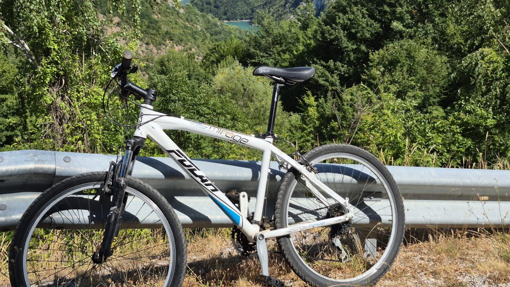 Berg runter ging alles so schön einfach, aber merke: Wenn du runter rollen kannst, musst du Berg auf mehr strampeln. Also Rückweg angetreten und ab in den Hamstergang, viel Treten, wenig Vorschub. Mittlerweile war es auch schon Nachmittag und die Sonne hatte gut gearbeitet, also die ganze Plackerei bei freundlichen 35 Grad – herzlichen Glückwunsch! Mit vielen Pausen, teilweise auch mal ner Runde schieben, haben wir dann den Scheitelpunkt auf dem Rückweg erreicht und ab da ging es bis zur Ausleihstation nur noch bergab (gesamt ca. 24 km gefahren, geschoben, geflucht). Anschließend sind wir dann noch zu Fuß zum örtlichen Beach gegangen und haben uns in die kühlen Fluten des Pivsko Sees gestürzt, um das Temperaturniveau wieder auf „normal“ einzustellen.