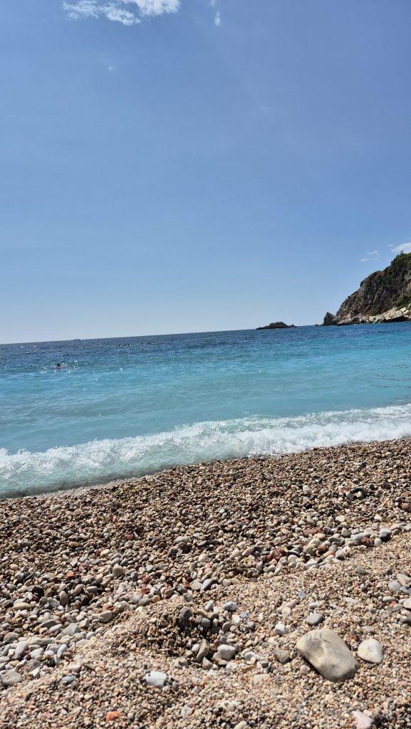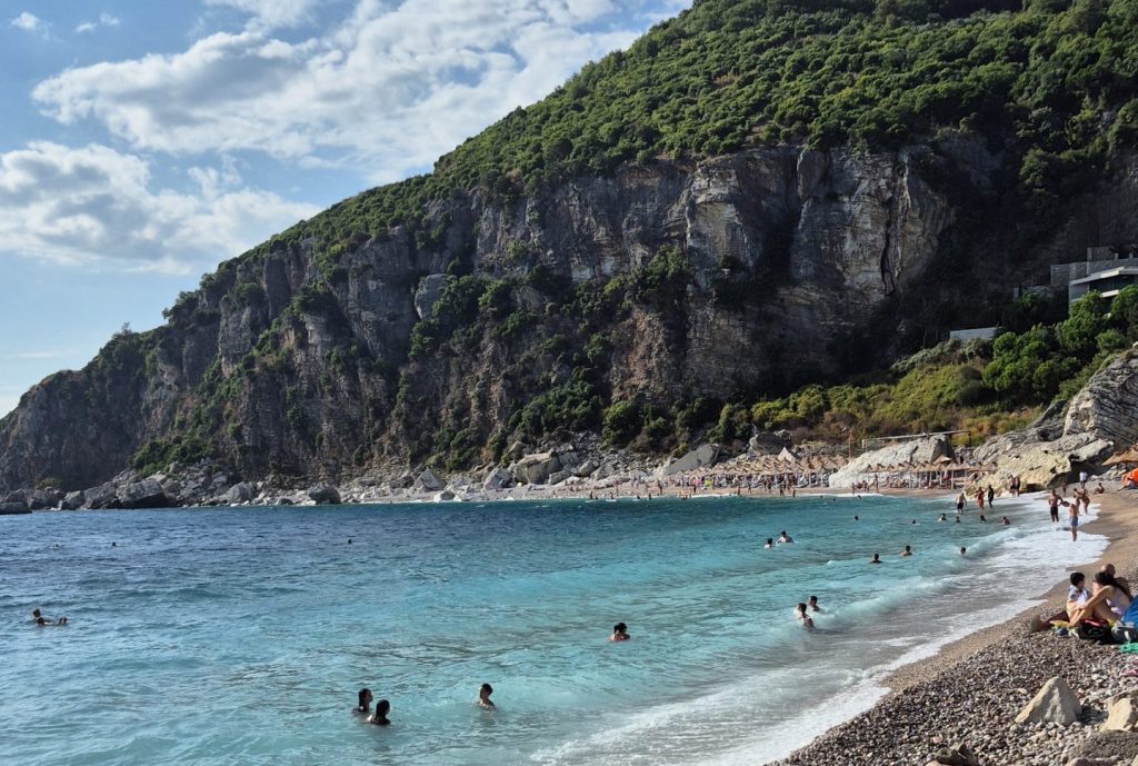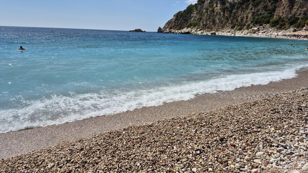 Den Strand erreicht man durch eine recht steile Abfahrt, auch hier ist der Gegenverkehr nicht erwünscht. Besonders nicht auf dem letzten Drittel, da war die Straße nämlich richtig schmal, vermutlich handelt es sich bei diesem Weg um der letzten Abschnitt der Baustellenzufahrt. Parkplätze findet man reichlich vor dem verlassenen Hotel und diese sind auch noch kostenfrei. Der Strand unterteilt sich in öffentlich und kostenpflichtig. Wir haben nur den frei zugänglichen Teil besucht und waren dort angenehm überrascht. Es war sauber – da kennen wir aus unserem Albanienurlaub ganz andere Zustände. Wer einen Sandstrand erwartet, ist hier in beiden Bereichen falsch, Kies begrüßt den Fuß und somit bekommt man auch noch eine Fußmassage gratis. Ins Wasser geht es recht steil herunter und auch im Wasser lauern Steine, also recht schnell anfangen zu schwimmen, ist sinnvoll. Die Brandung ist kräftig, damit ist dies kein Ort, an dem man kleine Kinder im seichten Wasser spielen lassen kann. Das Wasser leuchtet schön blau und es gibt auch keine Geruchsbelästigungen von der Seeseite – Wasserqualität ist also ok!