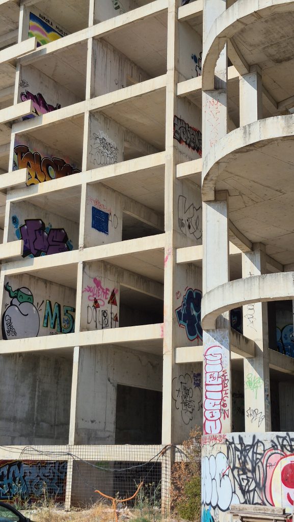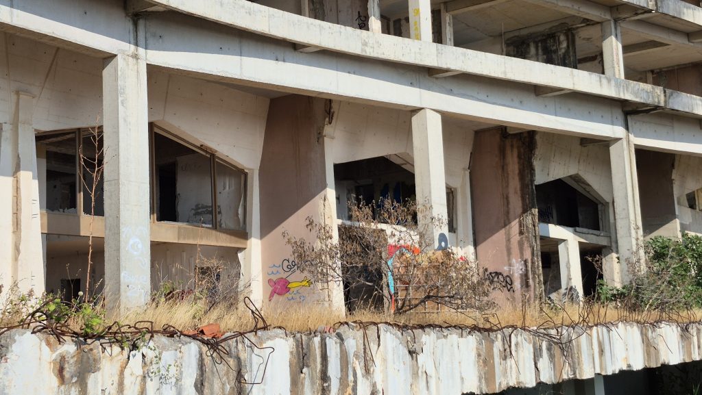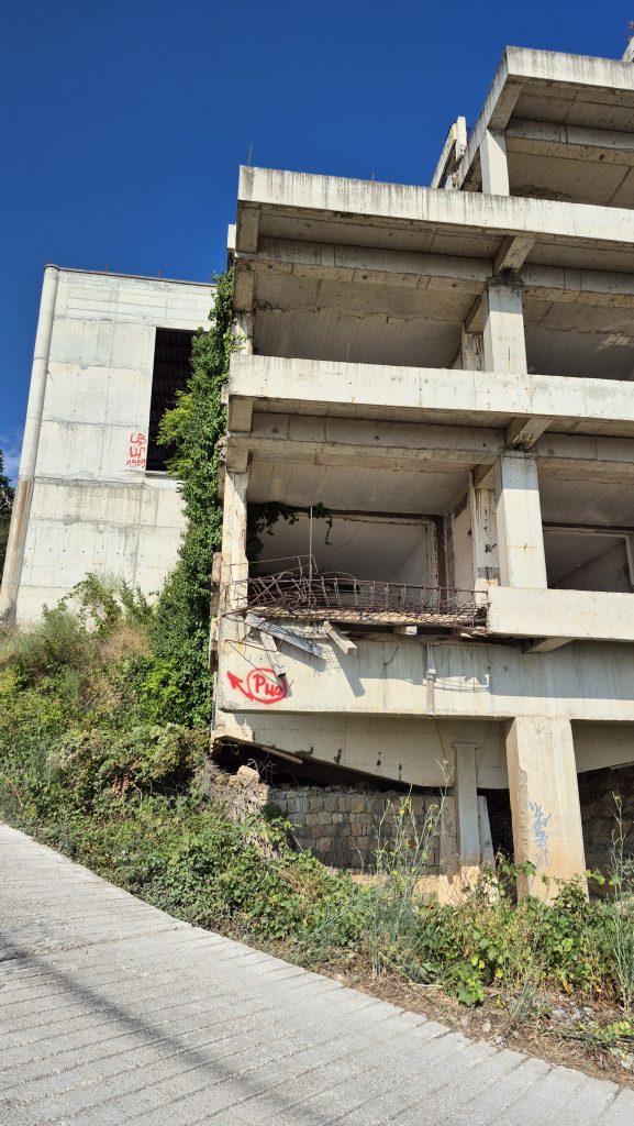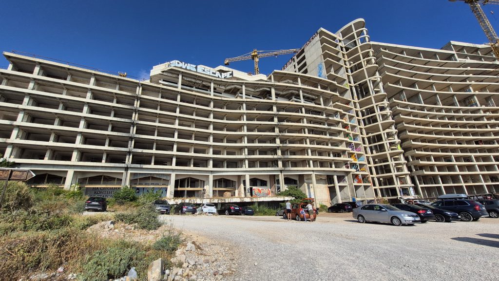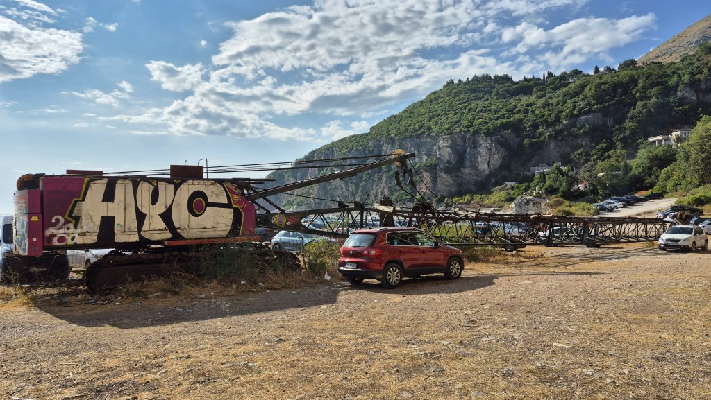 Zu dem verlassenen Hotel konnte ich herausfinden, dass es sich um ein Erbe aus der jugoslawischen Ära handelt und der Baubeginn war vermutlich schon zwischen 1980 und 1990. 2002 sollte es eine Privatisierung geben, die jedoch aus diversen Gründen, Fälschung einer Bankbürgschaft, Korruption und vermutlich noch andere Ursachen nicht zustande kam. Seitdem steht die Baustelle in der Gegend herum und falls es doch einmal weitergehen sollte: Die Kräne sind schon mal da. Vermutlich ist der finanzielle Aufwand zur Fertigstellung so immens, dass dieser Strand noch eine ganze Weile so weiter genutzt werden kann, wie aktuell möglich.