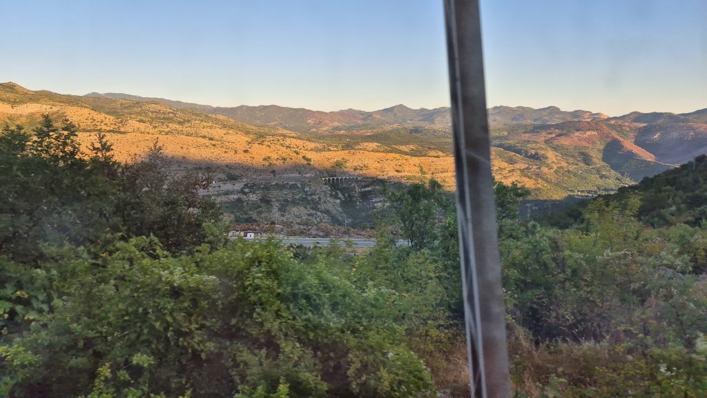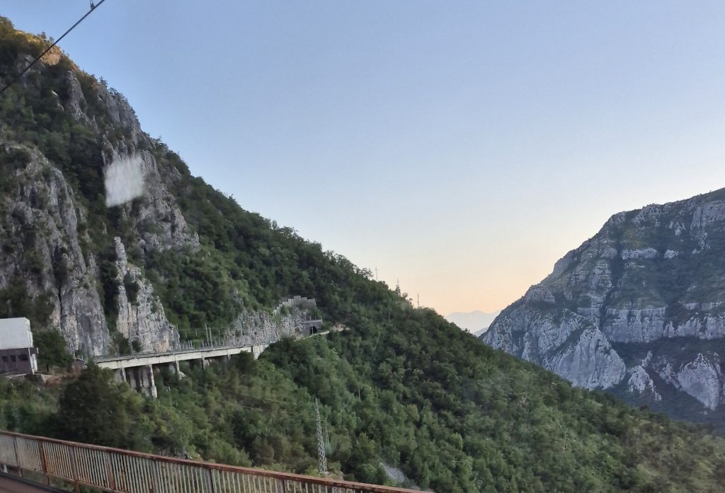 Wenn man nicht gerade durch einen der vielen Tunnel fährt, ist die Fahrt wirklich spannend und bietet spektakuläre Blicke in die Bergwelt. Beim Fotografieren muss man schon schnell sein, da man sonst wieder in einem Tunnel unterwegs ist und dort ist die Aussicht bauartbedingt recht schlecht. Durch die kurvige Streckenführung kann man die Brücke vor der Überquerung rechtzeitig sehen und sich schon einmal am Fenster in Position bringen, um die Überfahrt detailliert zu erleben.