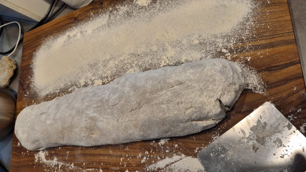 Nach der Garzeit wird der Teig mit ausreichend Mehl zu einer Rolle geformt, von der stechen wir die Teiglinge von ca. 90 Gramm ab. Diese werden dann je nach Wunsch in eine runde oder längliche Form gebracht, dürfen sich von der Verformung noch einmal eine Stunde unter einem feuchten Tuch erholen.