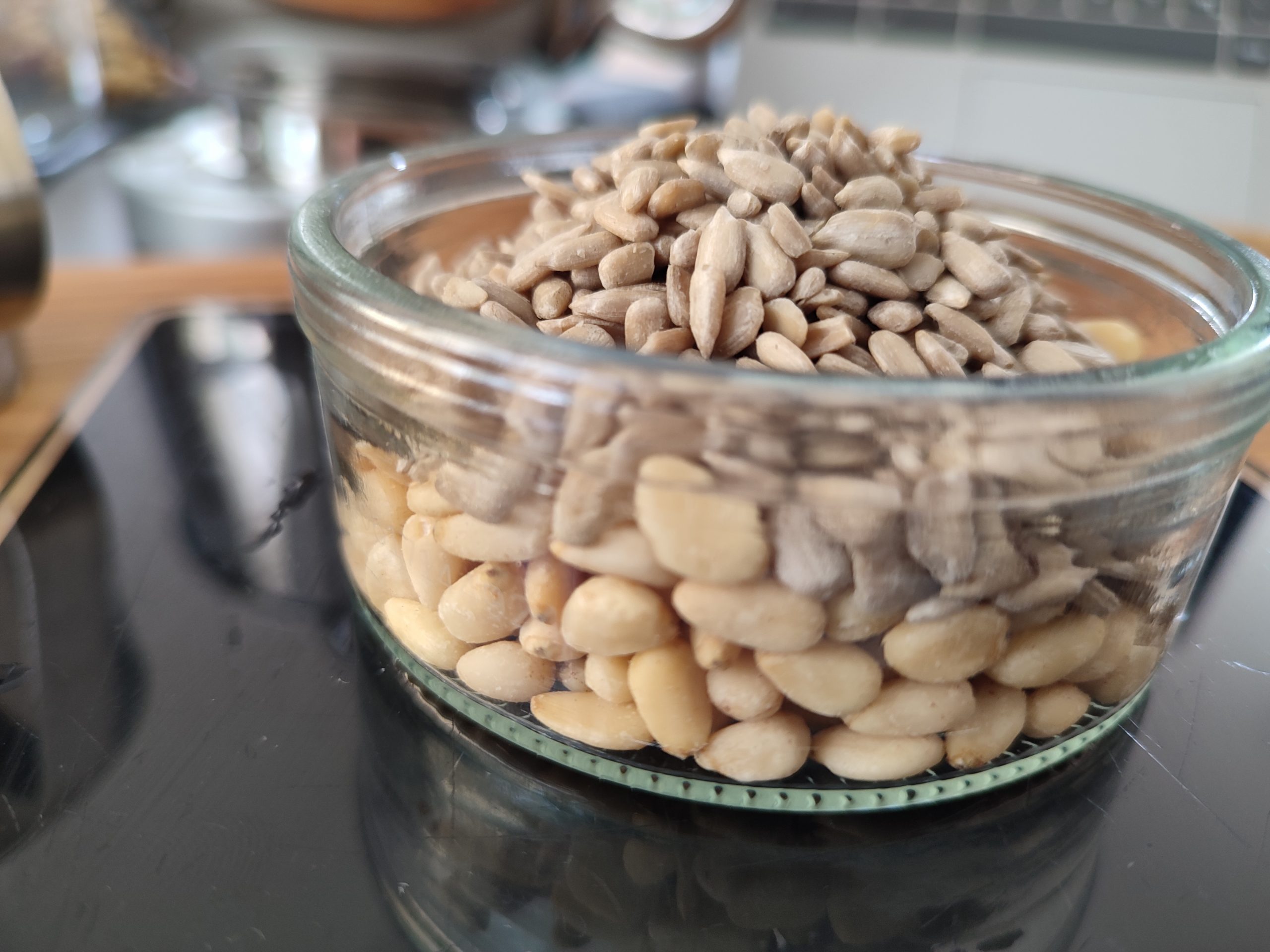 - 40 g Pinienkerne (alternativ können auch Cashewkerne verwendet werden, mit Pinienkernen ist der Geschmack etwas intensiver)