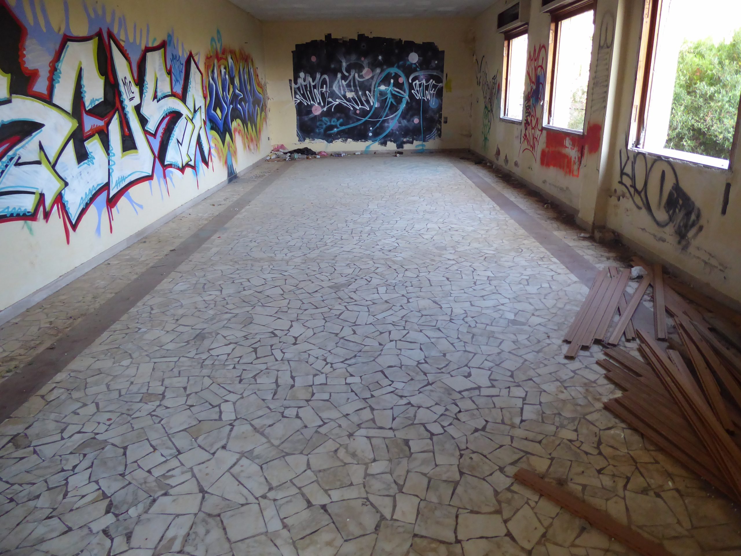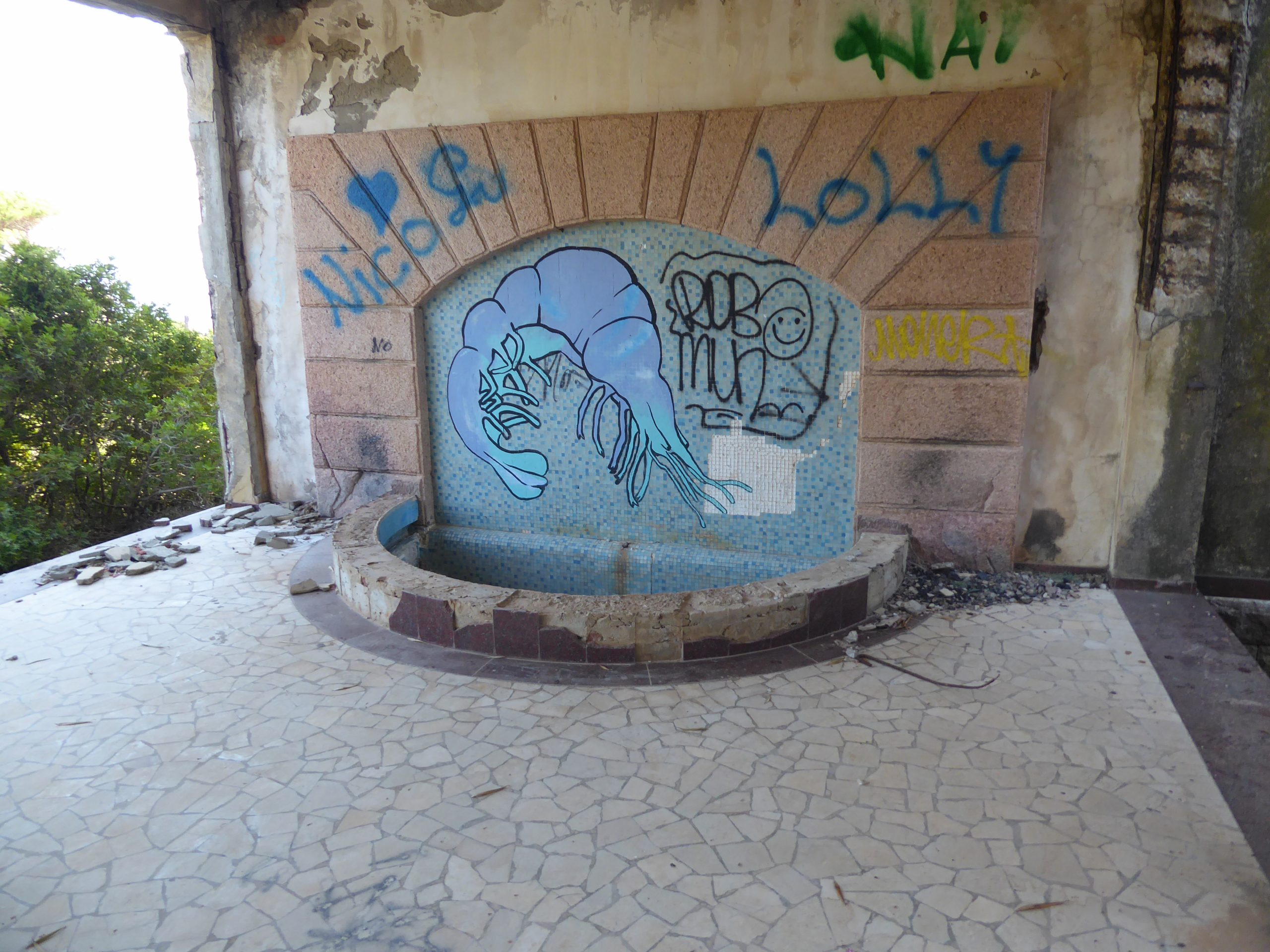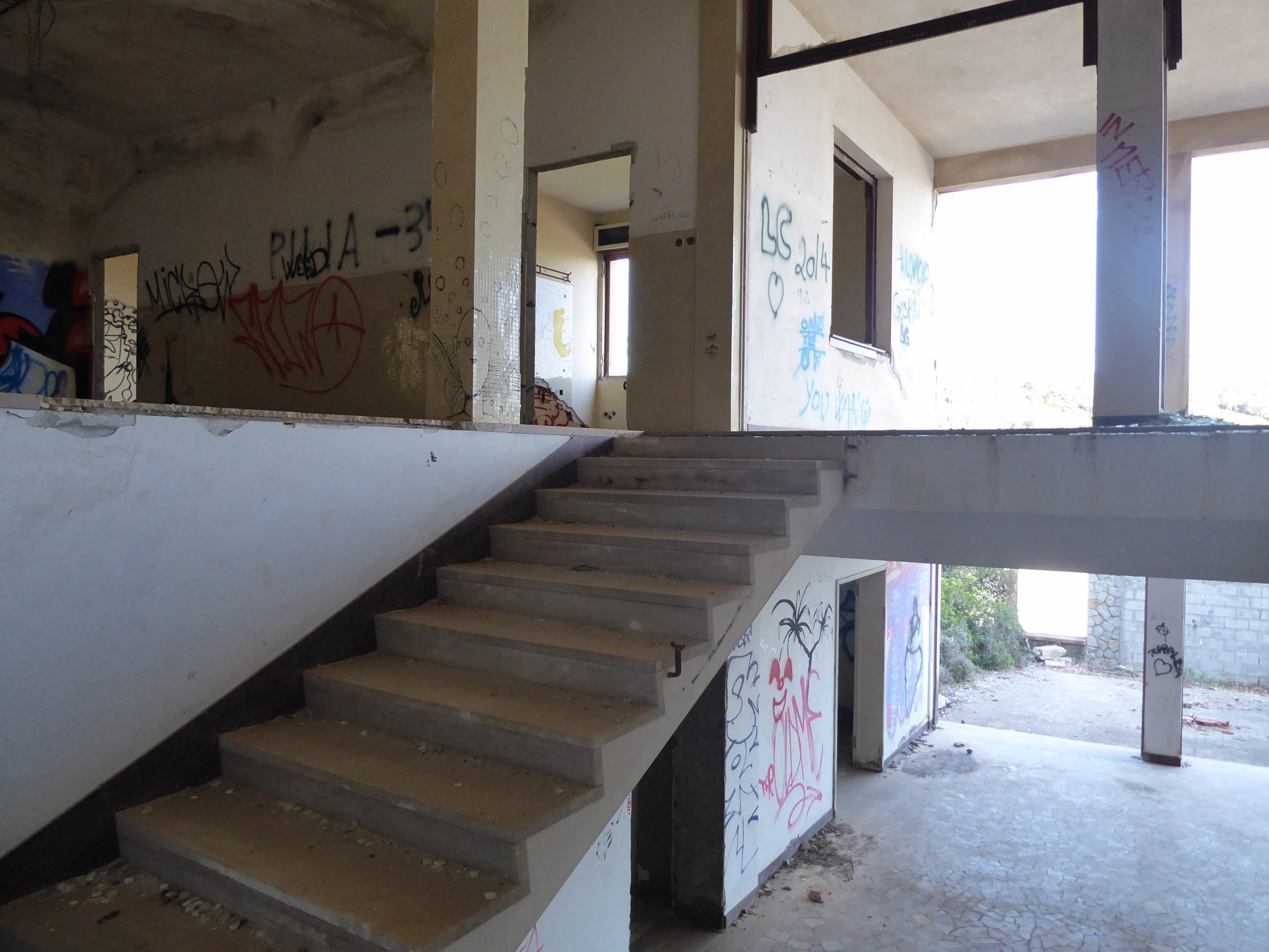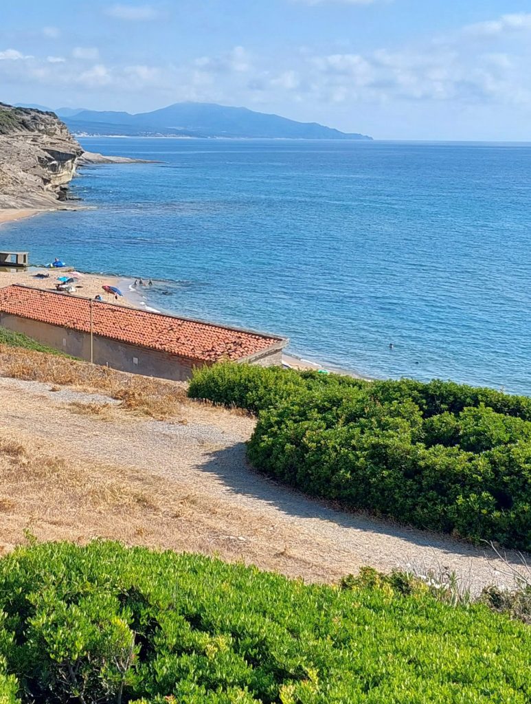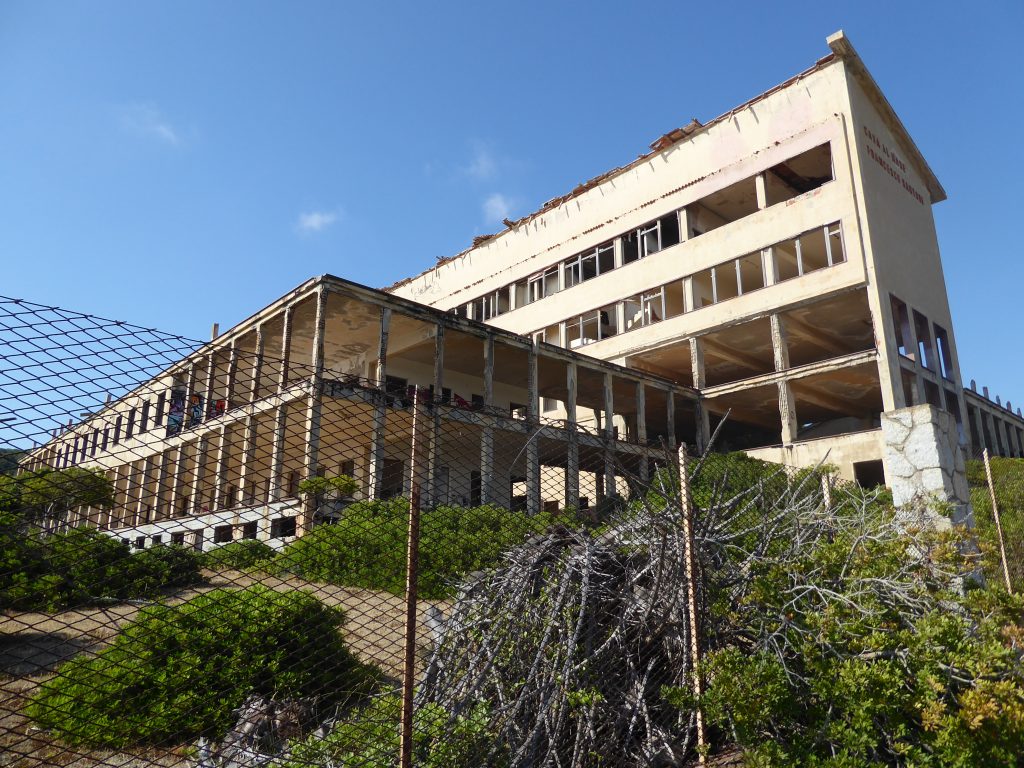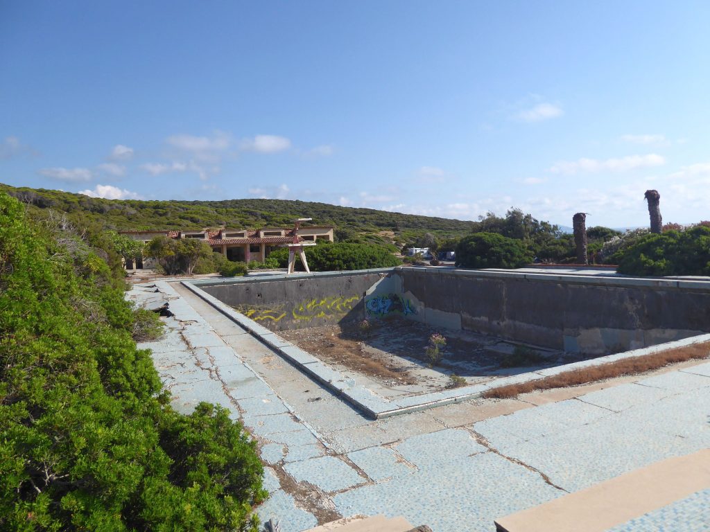 Da wir uns nun einmal mit den Bergarbeitern vertraut gemacht hatten, sind wir bei der Suche nach einem Strand diesem Thema treu geblieben. Wir haben uns auf den Weg zum Spiaggia di Funtanazza gemacht. Dort gab es früher eine Ferienanlage für die Kinder der Bergarbeiter. An der Einfahrt haben wir erst einmal acht Euro berappen müssen. Da wir diese Anlage aber unbedingt sehen wollten, mussten wir wohl oder übel bezahlen. Es hat sich gelohnt. Das Gelände wird auch wieder dem Verfall überlassen, aber man kann noch gut erkennen, dass es einmal bessere Zeiten erlebt hat. Durch die nicht ganz günstigen Parkgebühren war der Strand angenehm leer. Dort haben wir dann noch eine Weile gechillt, bis es Zeit für die eineinhalbstündige Heimreise war.