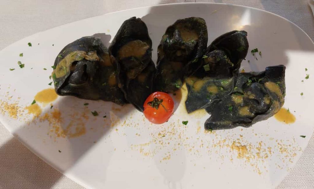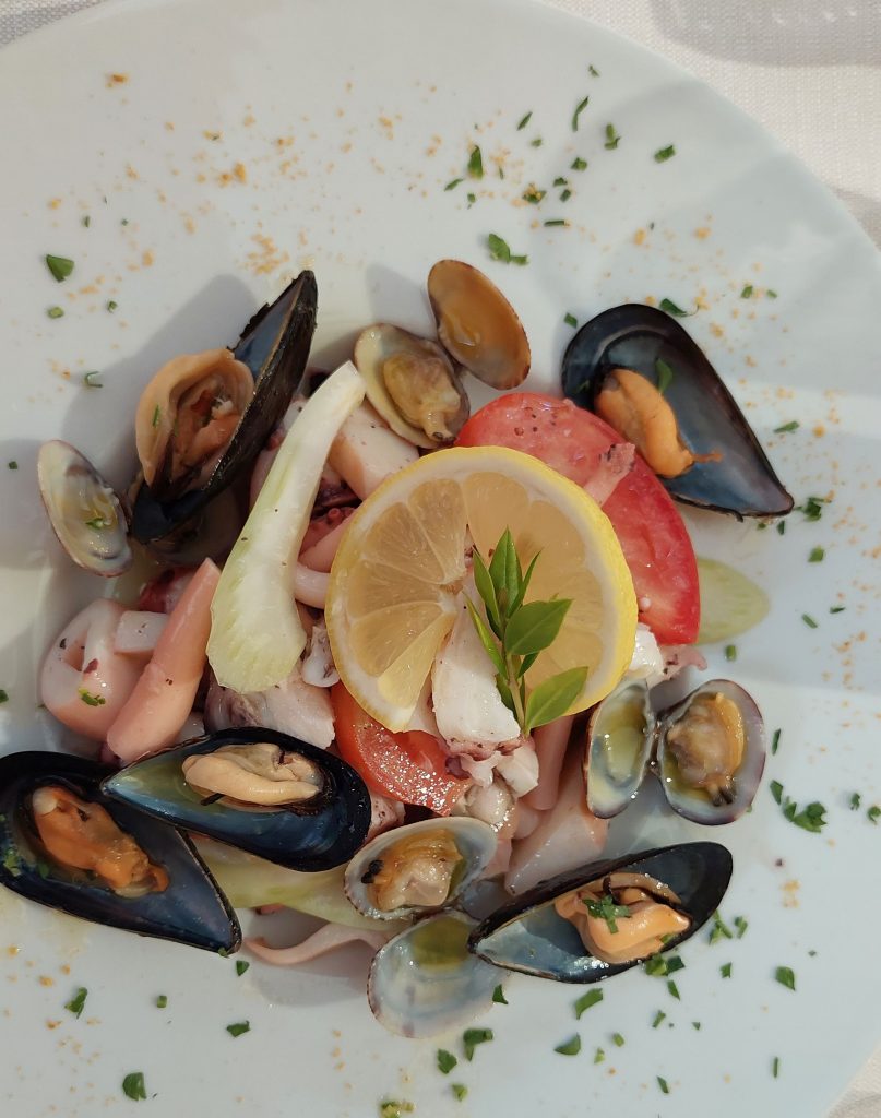 Am Nachmittag waren wir noch zum letzten Mal für dieses Jahr im Mittelmeer baden gewesen und am Abend ließen wir uns noch einmal im Del Capitano mit diversen Spezialitäten del mare verwöhnen. Ich habe heute mit dem Insalata Mare mein Tintenfischabitur nachgeholt, natürlich auch mit sichtbaren Saugnäpfen – optisch schon komisch, aber lecker. Die Zuppa di Cozze kannte ich zwar schon vom letzten Besuch, die musste aber wieder sein und das war genau richtig so – schon um noch einmal die tolle Schüssel zu präsentieren. Der Gatte hatte geräucherten Zackenbarsch und danach schwarze Tortelloni mit Fischfüllung und Bottarga-Creme. Der Junior hat sich eine Pizza einverleibt, da macht man ja bei Kindern nichts verkehrt. Zum Ausklang die üblichen Verdächtigen: Espresso, Tiramisu und Mirto. Zusammengefasst ein gelungener Abend, der den Abschied nicht unbedingt einfacher macht, sondern einfach Lust auf noch mehr.