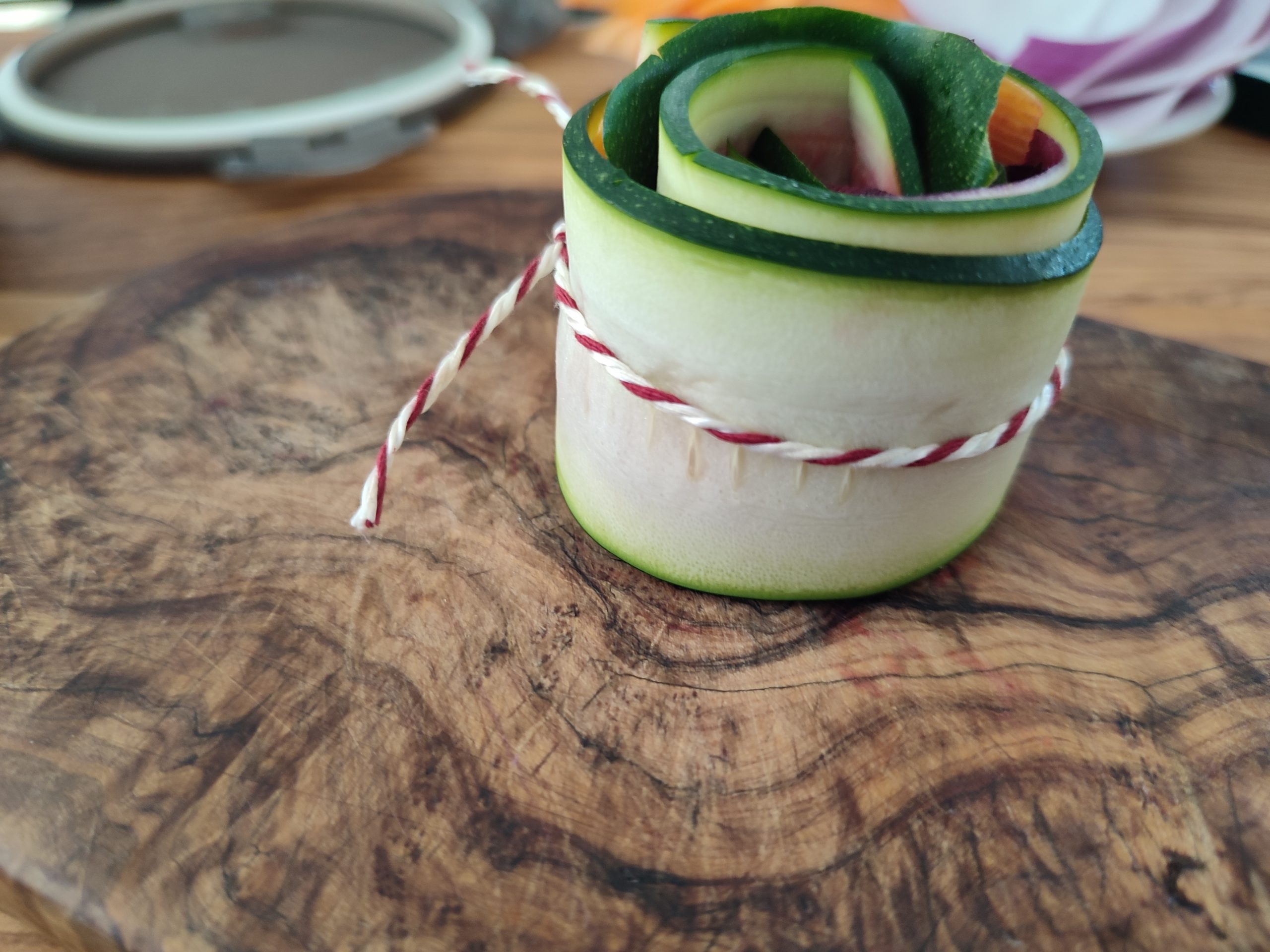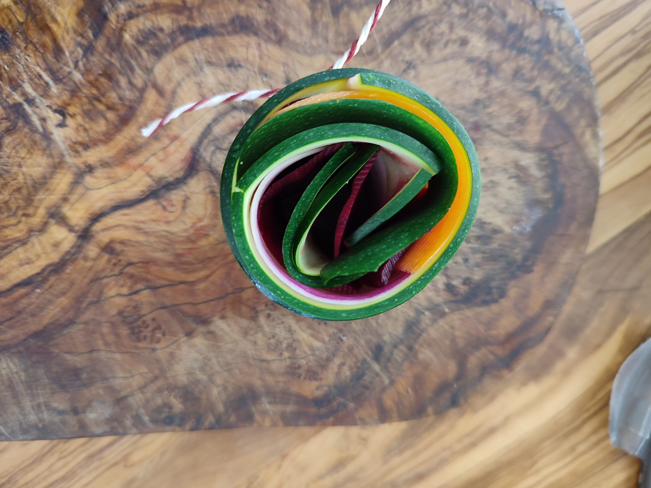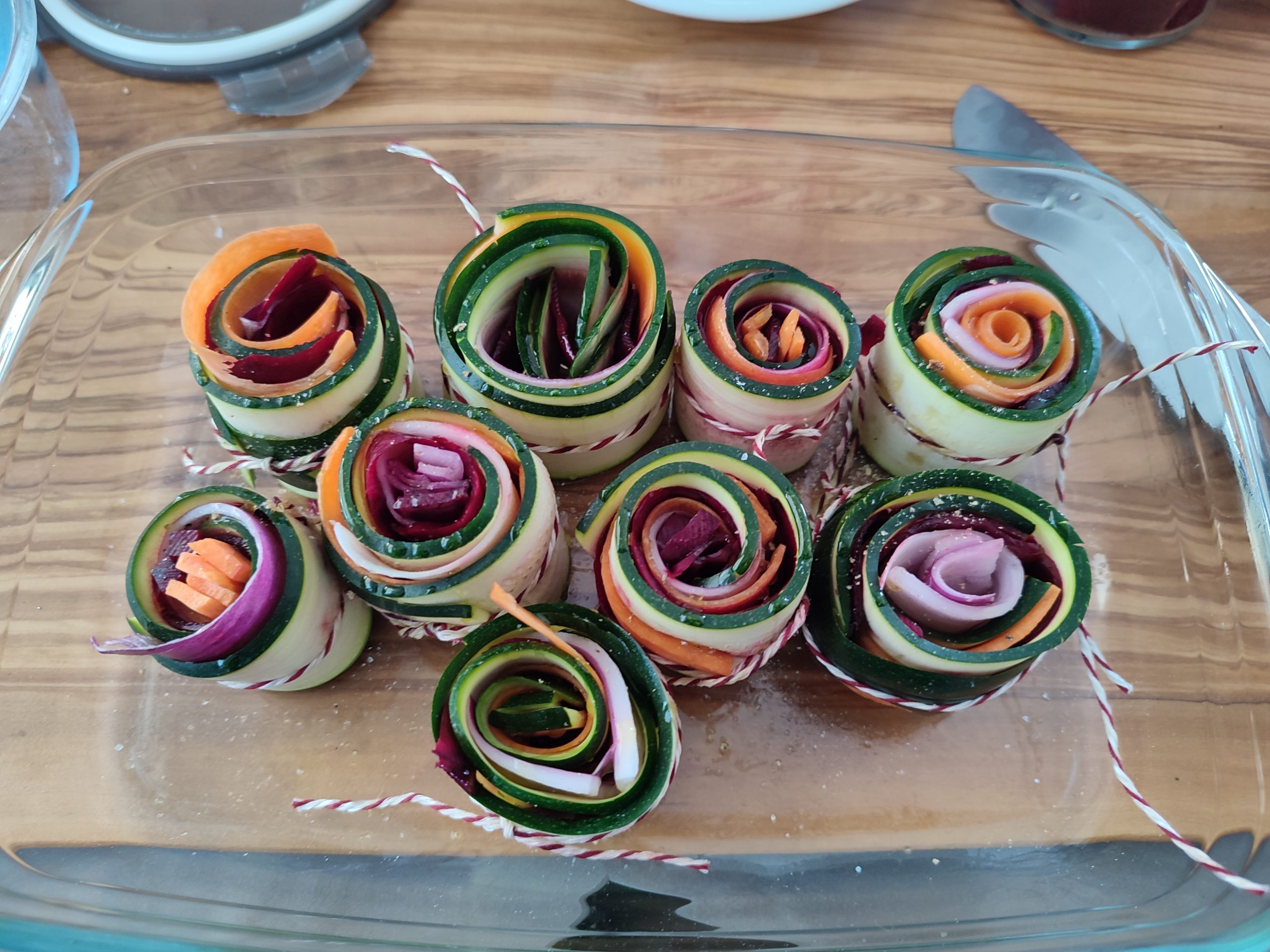 Das Gemüse mit einem Sparschäler oder Gemüsehobel in dünne Scheiben schneiden. Die verschiedenen Gemüsesorten übereinanderlegen und vorsichtig einrollen. Die fertige Rolle mit einem Stück Bratenschnur zusammenbinden und die fertige Gemüserolle in eine geölte Auflaufform setzen. Wenn alle Gemüserollen fertig sind und in der Form wohnen, werden diese gepfeffert und gesalzen und mit etwas Olivenöl beträufelt.