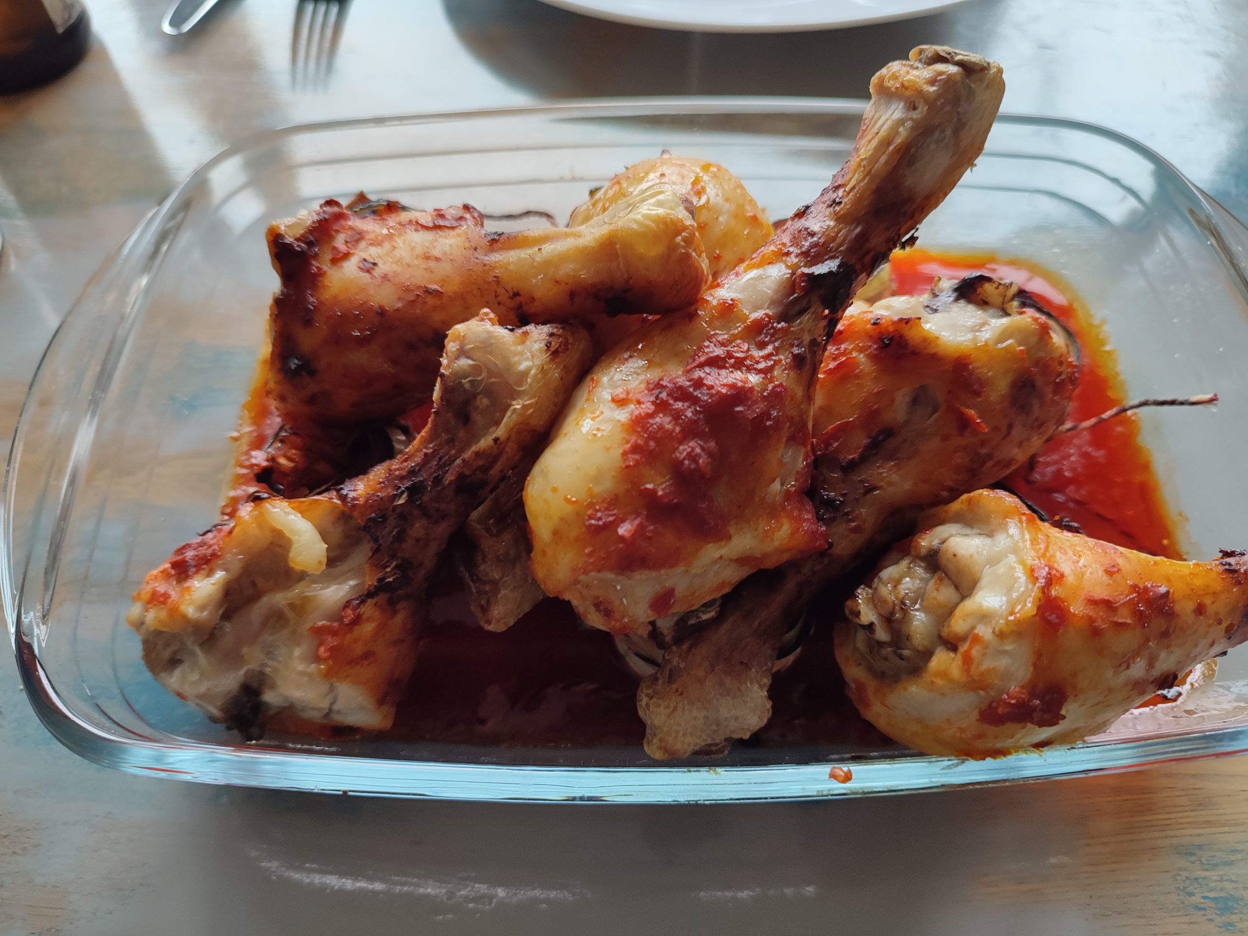 Für die Marinade wird die Paprikapaste mit der gehackten Knoblauchzehe und dem Olivenöl vermischt. Je nach Geschmack kann hier auch mit Kräutern variiert werden: Wer es eher asiatisch mag, nimmt reichlich Koriander; für die mediterrane Variante nimmt man Basilikum und Oregano. Pfeffer und Salz gibt jeder nach Geschmack hinzu. Alles gut durchrühren und mit einem Küchenpinsel die Keulen damit bestreichen.