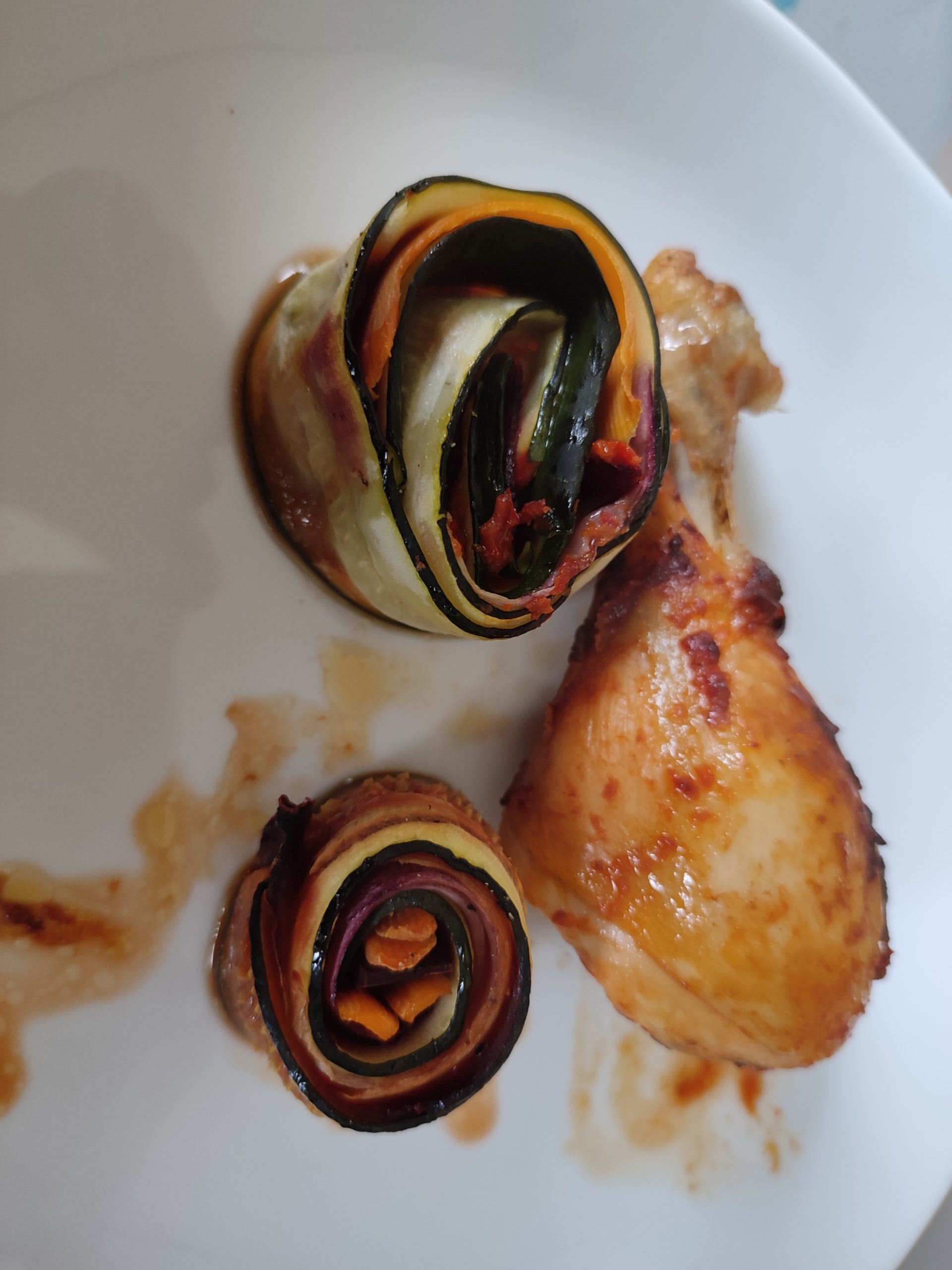Hähnchenkeule am Galgen mit bunten Gemüserollen