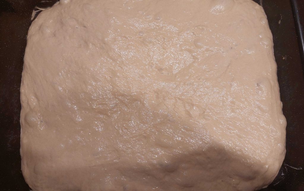 Am Backtag alle Komponenten zu einem weichen, fast flüssigen Teig verarbeiten. Wie auch bei meinen anderen Ciabatta-Rezepten bekommt der Teig seine Stabilität durch den Reifeprozess und regelmäßiges Falten von außen nach innen. Dazu geben wir den Teig in eine Wanne oder entsprechend große Auflaufform und falten diesen alle 30 Minuten – insgesamt viermal. Dabei werdet ihr merken, dass nach jeden Faltvorgang der Teig weniger flüssig wird und eine Struktur annimmt.
