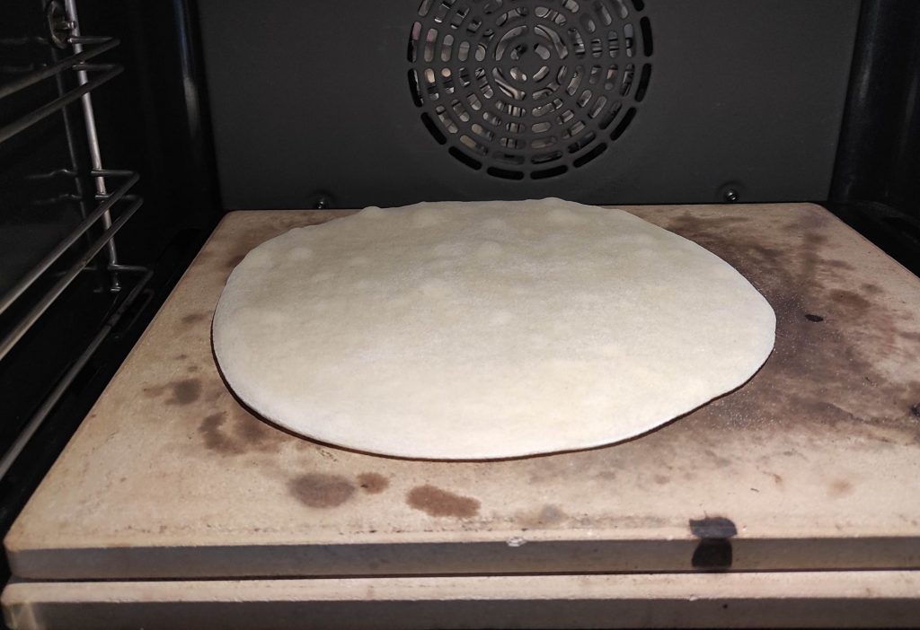 Nun beginnt die Herstellung der „Airbags“. Dazu ist der Backofen auf maximale Temperatur, mindestens jedoch 250°C, vorgeheizt, optimal wird auf Pizzastein gebacken. Mit den Pizzaschieber werden die Teigfladen in den heißen Ofen bugsiert, sobald sich auf der Oberseite die ersten Blasen bilden wird der Fladen gewendet. Ich verwende zum Backen ein Dampfbackofen und habe die Dampfzugabe dabei auf maximal gestellt. Wer über diese Annehmlichkeiten nicht verfügt, kann sich auch mit einer Sprühflasche behelfen. Wenn die Airbags aufgegangen sind, werden diese zum Auskühlen auf ein Brett gelegt.