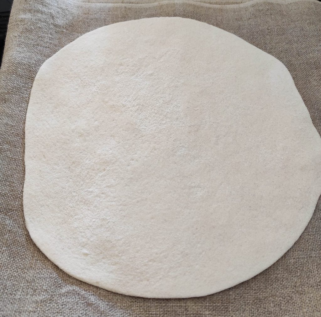 Nachdem die Teigkugeln ihr Volumen fast verdoppelt haben, werden diese zu flachen Fladen mit ca. 2 mm Dicke verarbeitet. Ich benutze dazu ein Nudelholz mit Abstandshaltern. Die ausgerollten Fladen werden in Bäckerleinen übereinander gestapelt. Dieser Stapel hat dann auch noch einmal 1 Stunde Ruhezeit. Nach der Ruhezeit wird der Stapel einmal auf den Kopf gedreht, so das der zuerst ausgerollte Fladen wieder oben liegt.