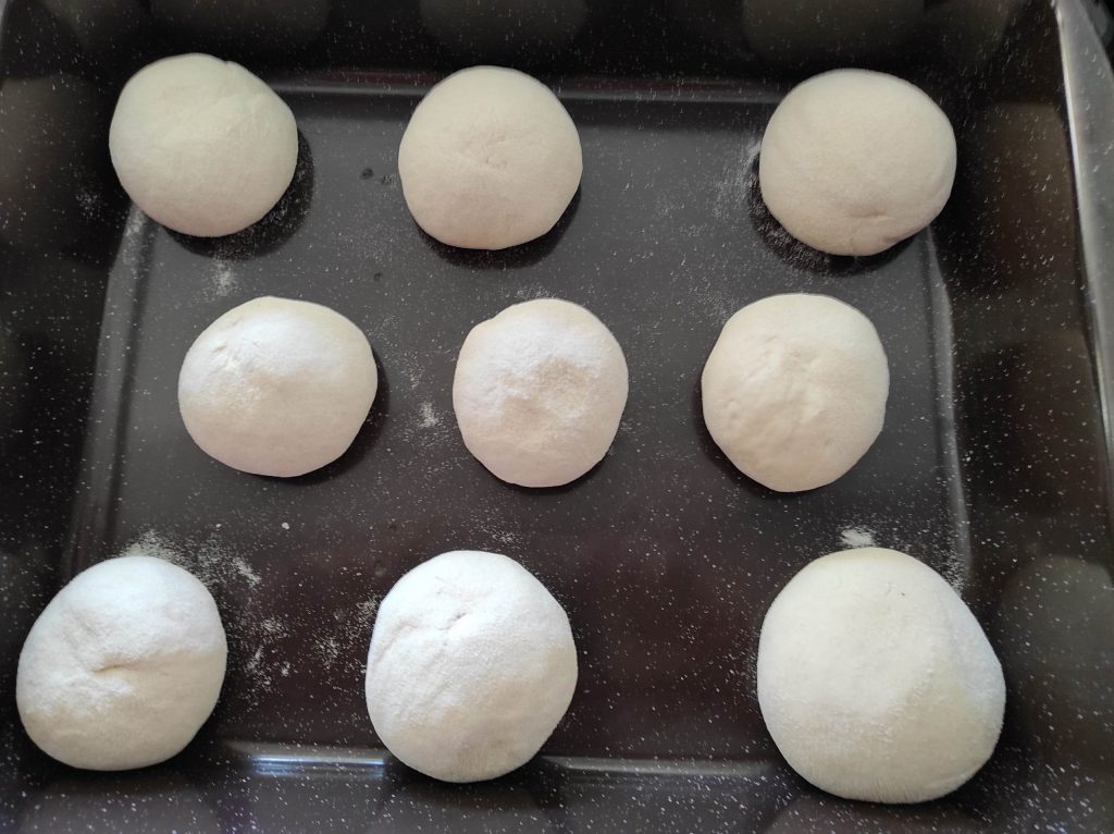 Davon werden Teigstücke zu je 100 g abgestochen und zu gleichmäßigen Kugeln geformt. Die Teigkugeln müssen noch mindestens eine Stunde ruhen. Dazu lege ich diese gut bemehlt wahlweise in einem Topf oder ein ähnliches Gefäß. Damit der Teig schön feucht und geschmeidig bleibt, decke ich das Gefäß mit einem feuchten Tuch ab.