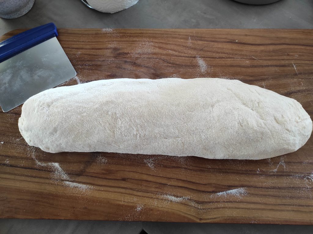 Die Zutaten und der Vorteig werden mit der Küchenmaschine gut miteinander verknetet – dann zehn Minuten ruhen lassen. Anschließend auf ein bemehltes Brett oder die Arbeitsfläche bringen und eine ungefähr 10 cm dicke Rolle daraus formen.